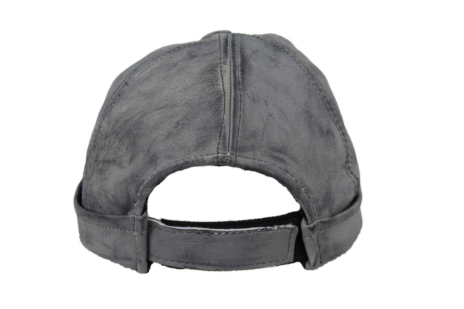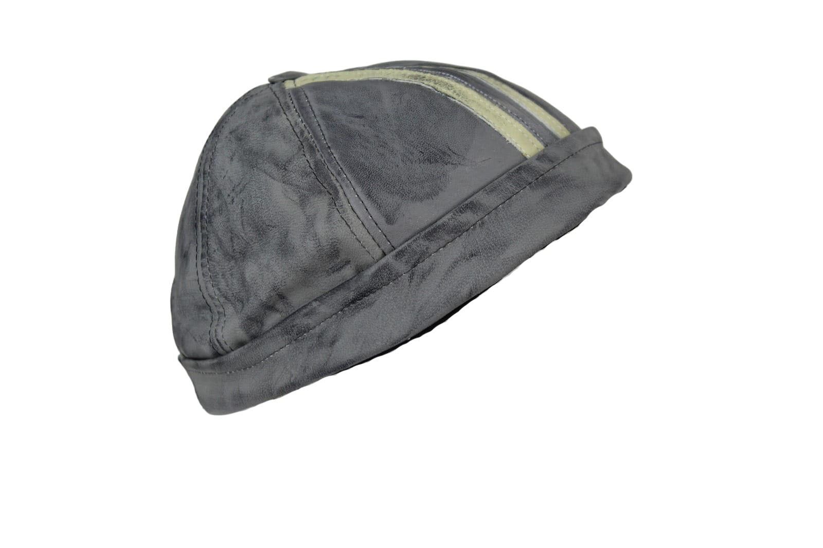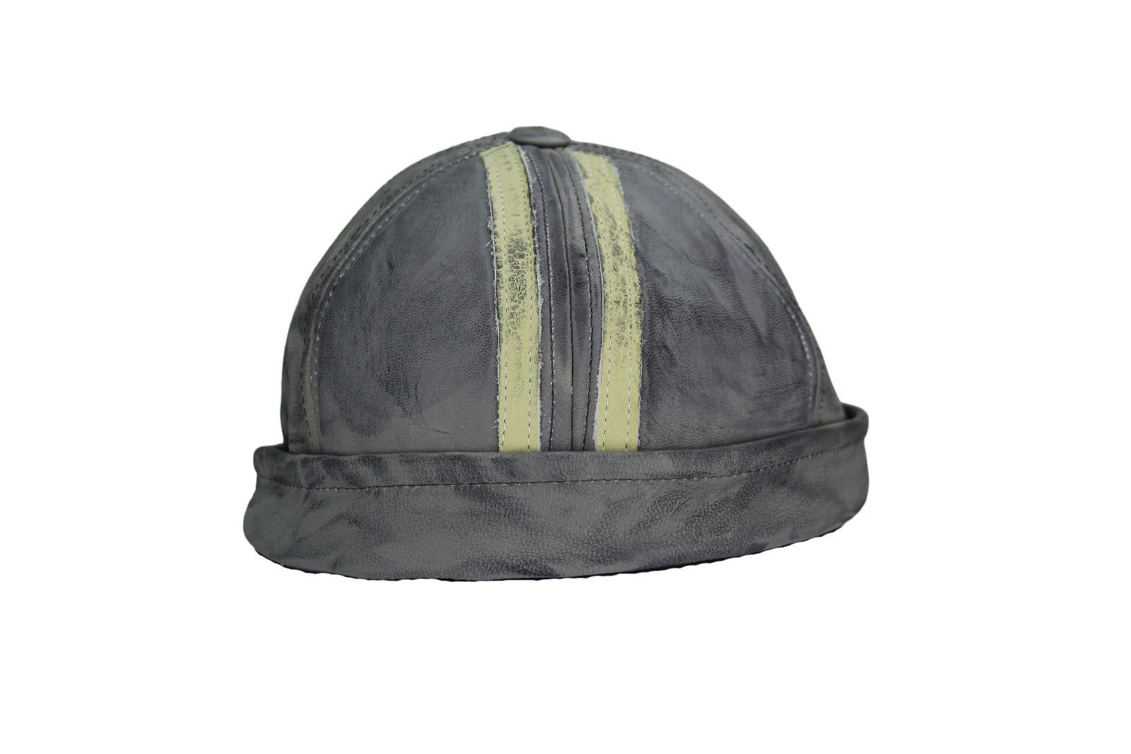 Biker Lamm Leder Ohne Schirm Docker Cap Mütze Herren Jeans Rocker Grau mit Streifen