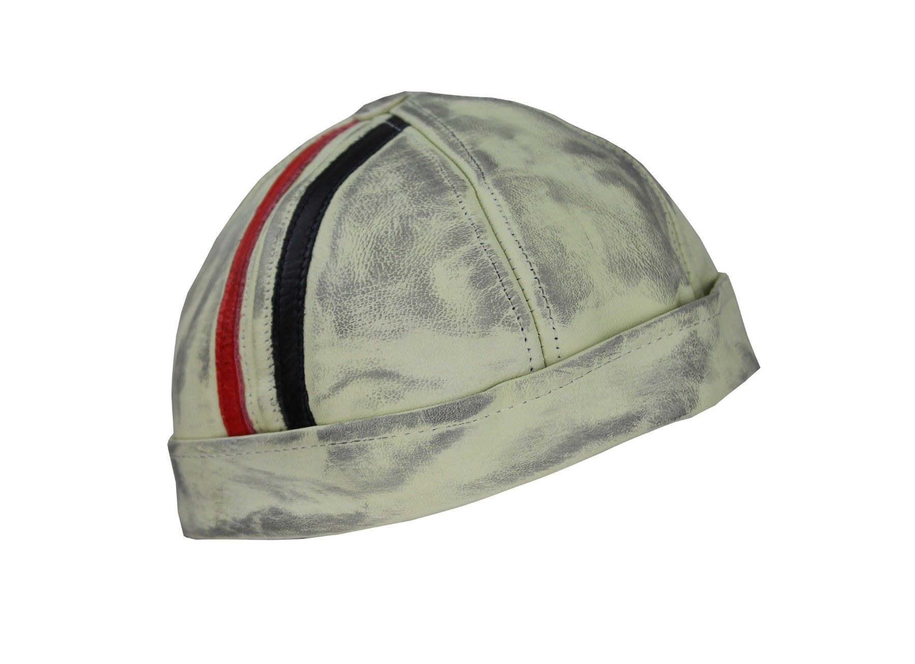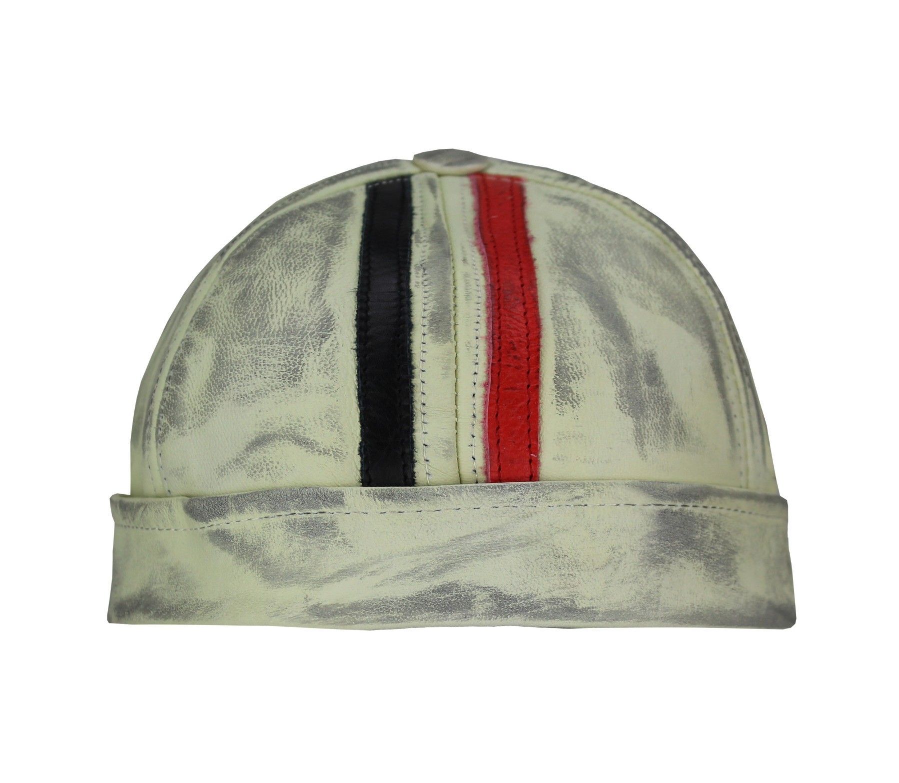 Biker Lamm Leder Ohne Schirm Docker Cap Mütze Herren Jeans Rocker Weiß mit Streifen