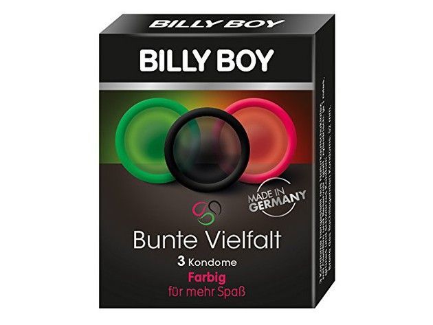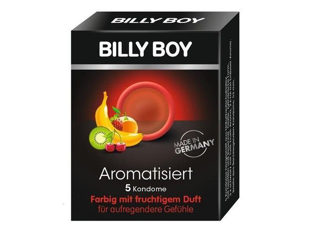 BIlly Boy farbig/aromatisiert/extra feucht farbig aus Latex für mehr Spaß 2 rote Erdbeeraroma-Kondome 3 schwarze Tutti-Frutti-Aroma-Kondome Standardgröße mit Reservoir transparent extra feucht mit hautsympathischem Gleitfilm