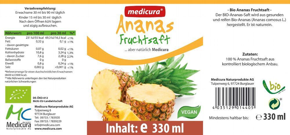 Medicura Bio Ananas 100 % Fruchtsaft - 330 ml Glasflasche