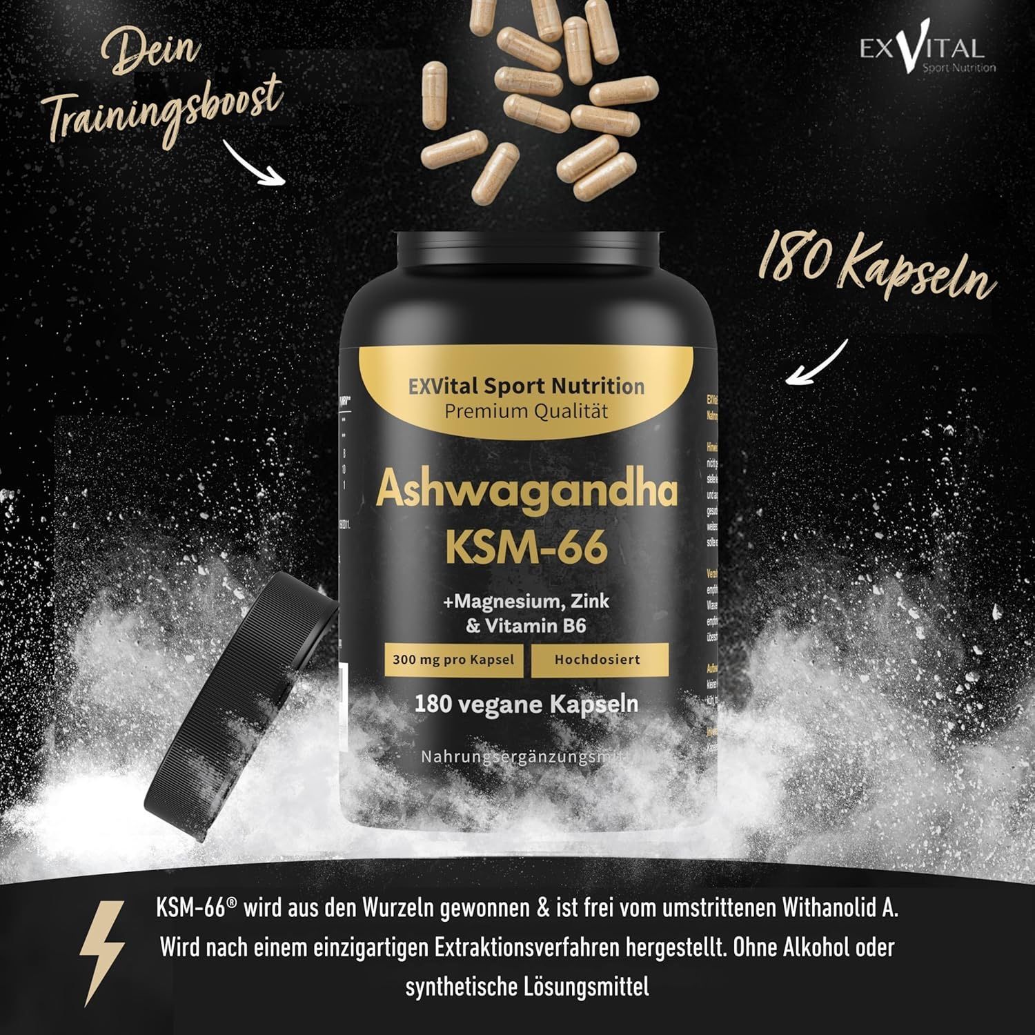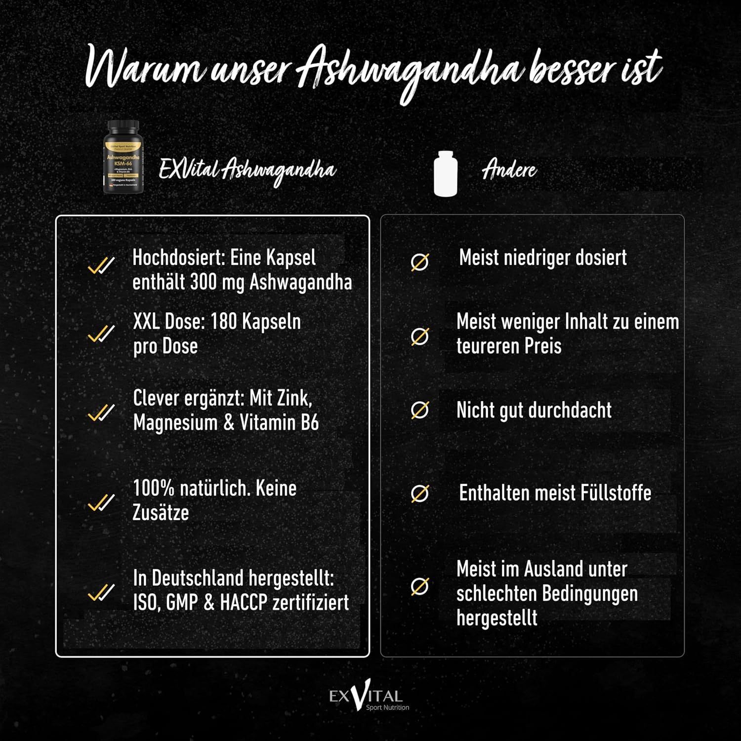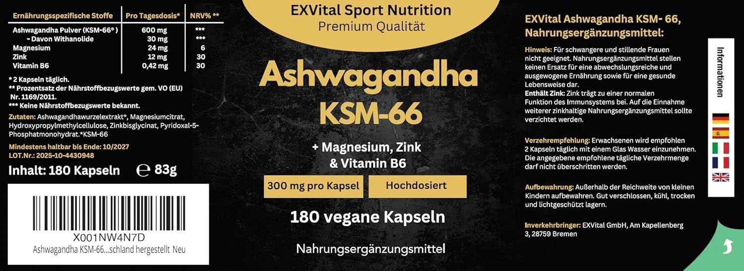 • Zutaten: Ashwagandhawurzelextrakt*, Magnesiumcitrat, Hydroxypropylmethylcellulose, Zinkbisglycinat, Pyridoxal-5-Phosphatmonohydrat. *KSM-66