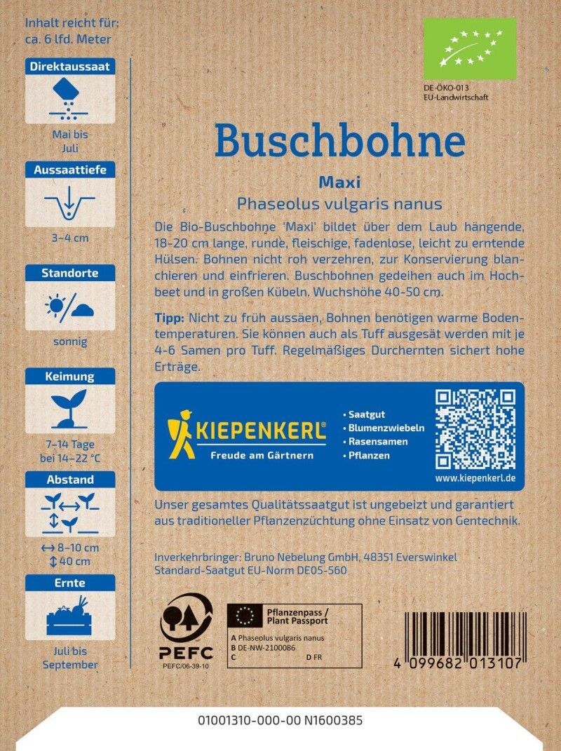 Kiepenkerl BIO Buschbohne Maxi, Gluckentyp, bringt 18-20 cm lange fleischíge Hülsen,