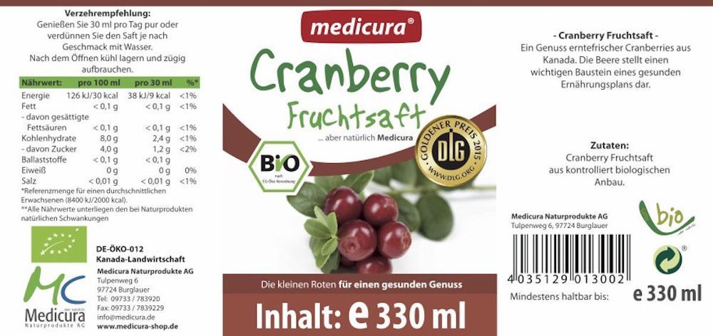 Medicura Bio Cranberry 100 % Fruchtsaft - 330 ml Glasflasche