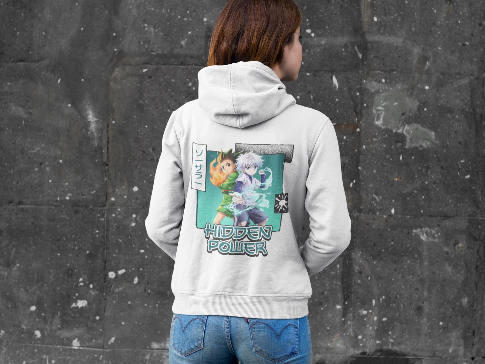 Tauchen Sie ein in die spannende Welt von Hunter x Hunter mit unserem Bio Damen Hoodie Kapuzenpullover, der die faszinierenden Charaktere Killua Zoldyck und Gon Freec aus der Serie zelebriert. Dieser Kapuzenpullover vereint Stil, Komfort und Nachhaltigkeit und ist ein Muss für Anime-Fans. Eigenschaf