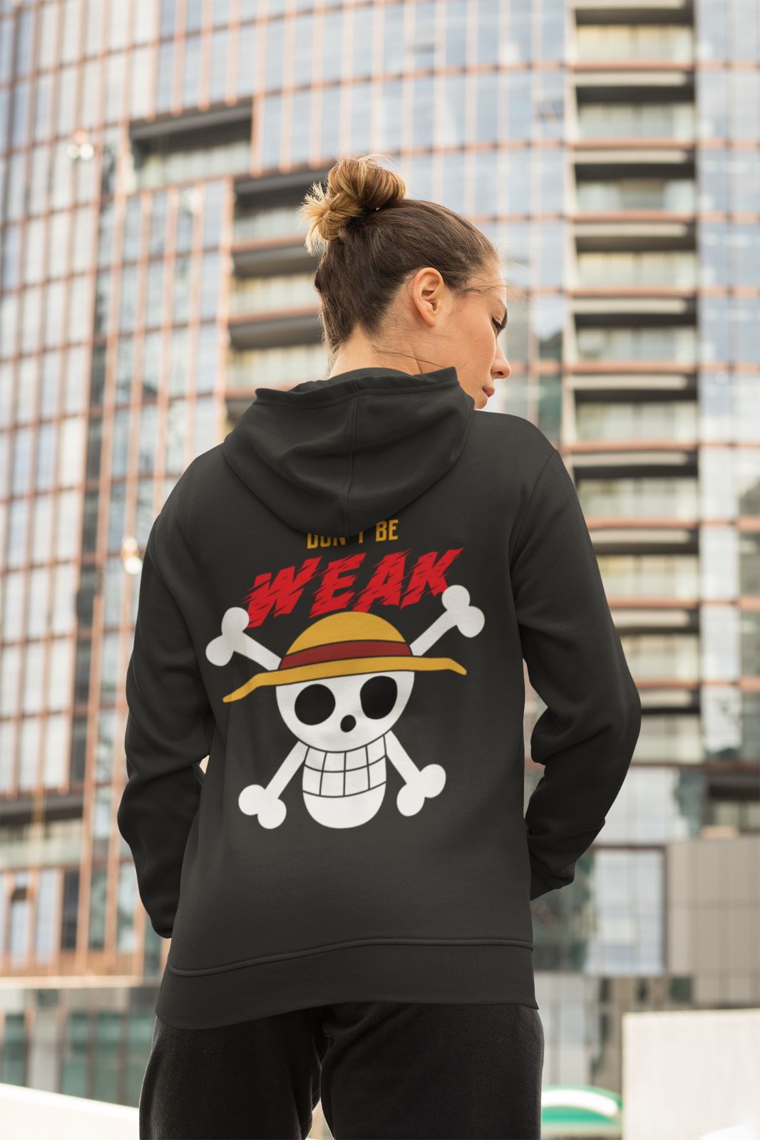 Der Damen Hoodie Kapuzenpullover Dont Be Weak Totenkopf ist ein hochwertiger und stylischer Kapuzenpullover aus Bio-Baumwolle, der sich an Fans des beliebten Anime One Piece richtet. Mit einem auffälligen Totenkopf-Design und einem inspirierenden Motto ist dieser Kapuzenpullover ein Muss für Anime-