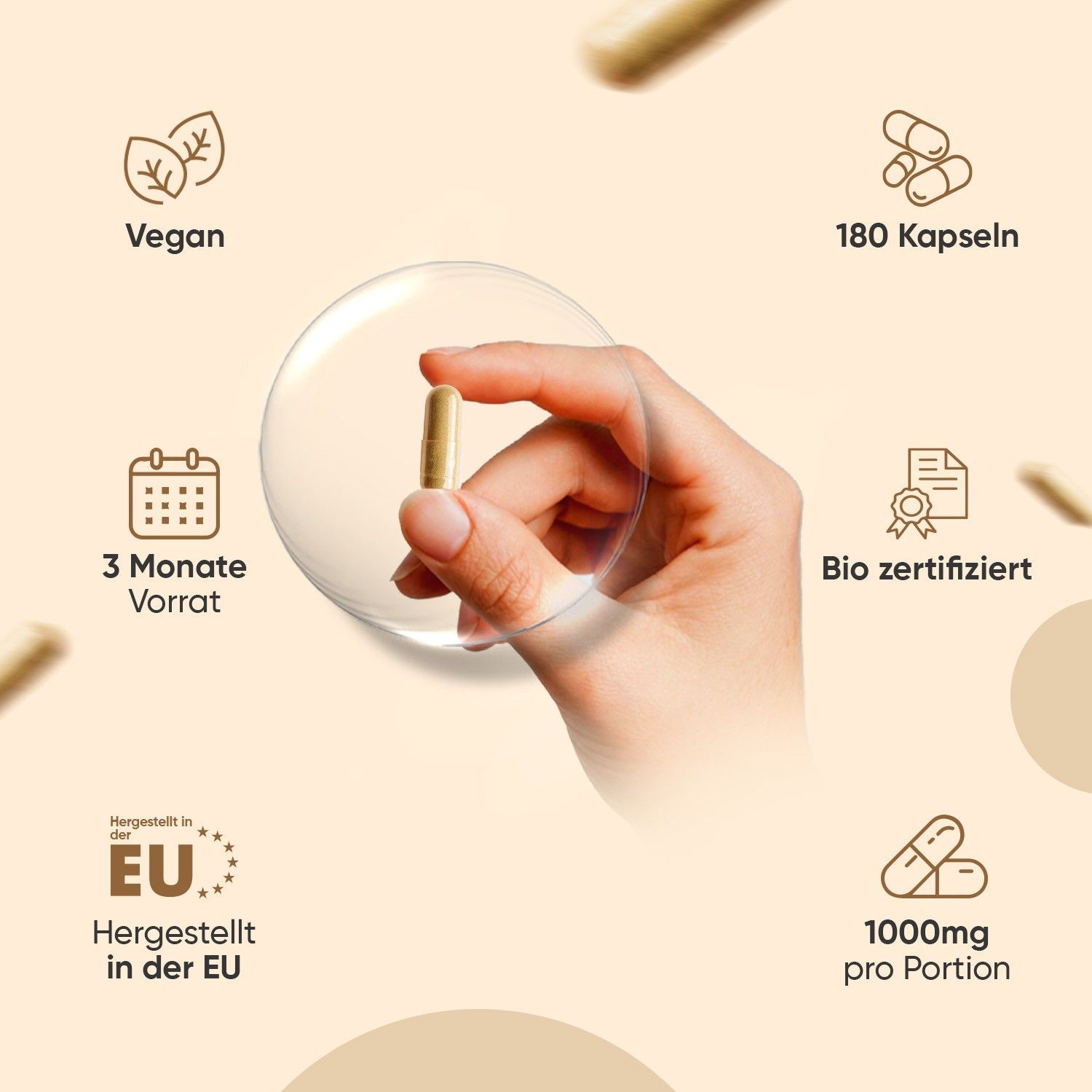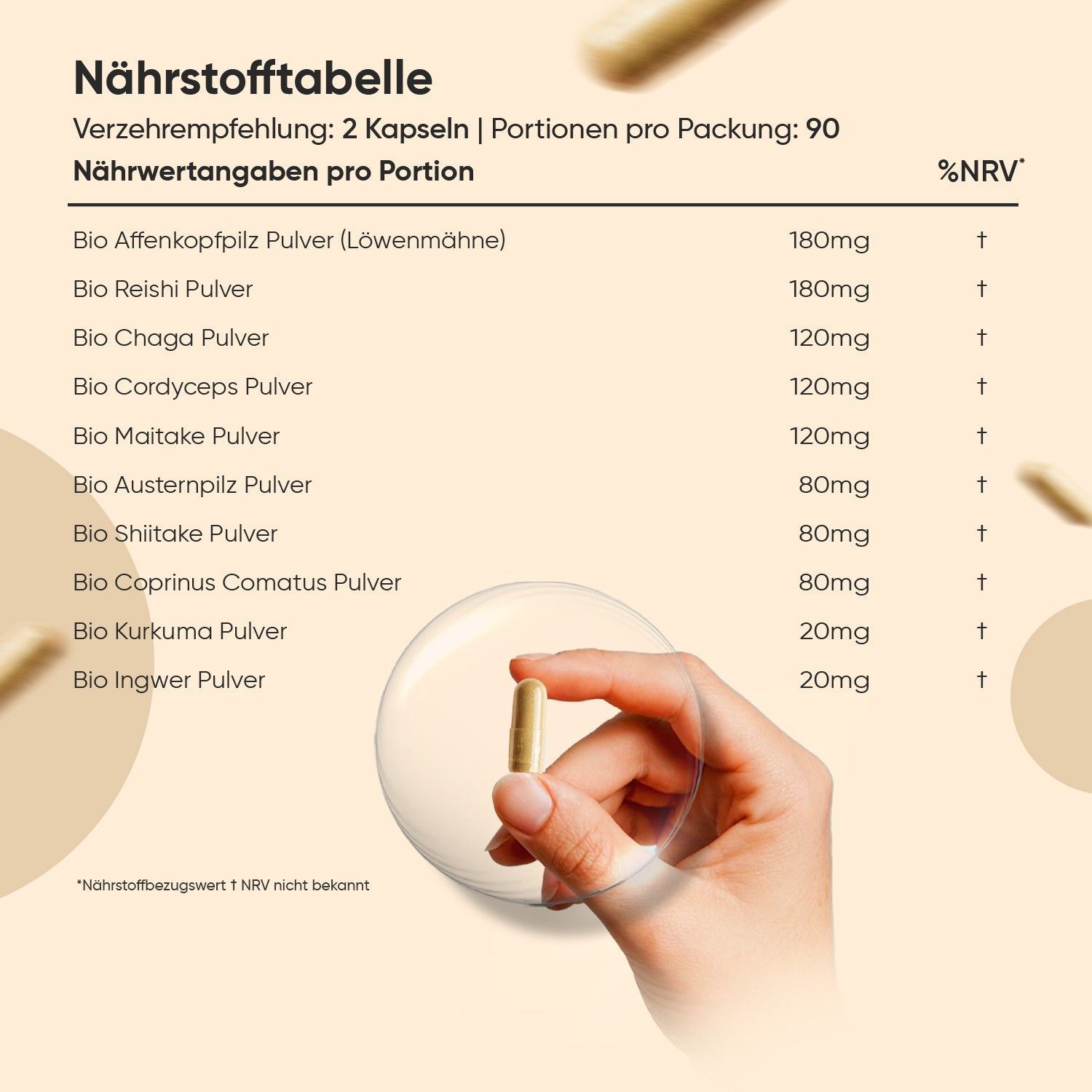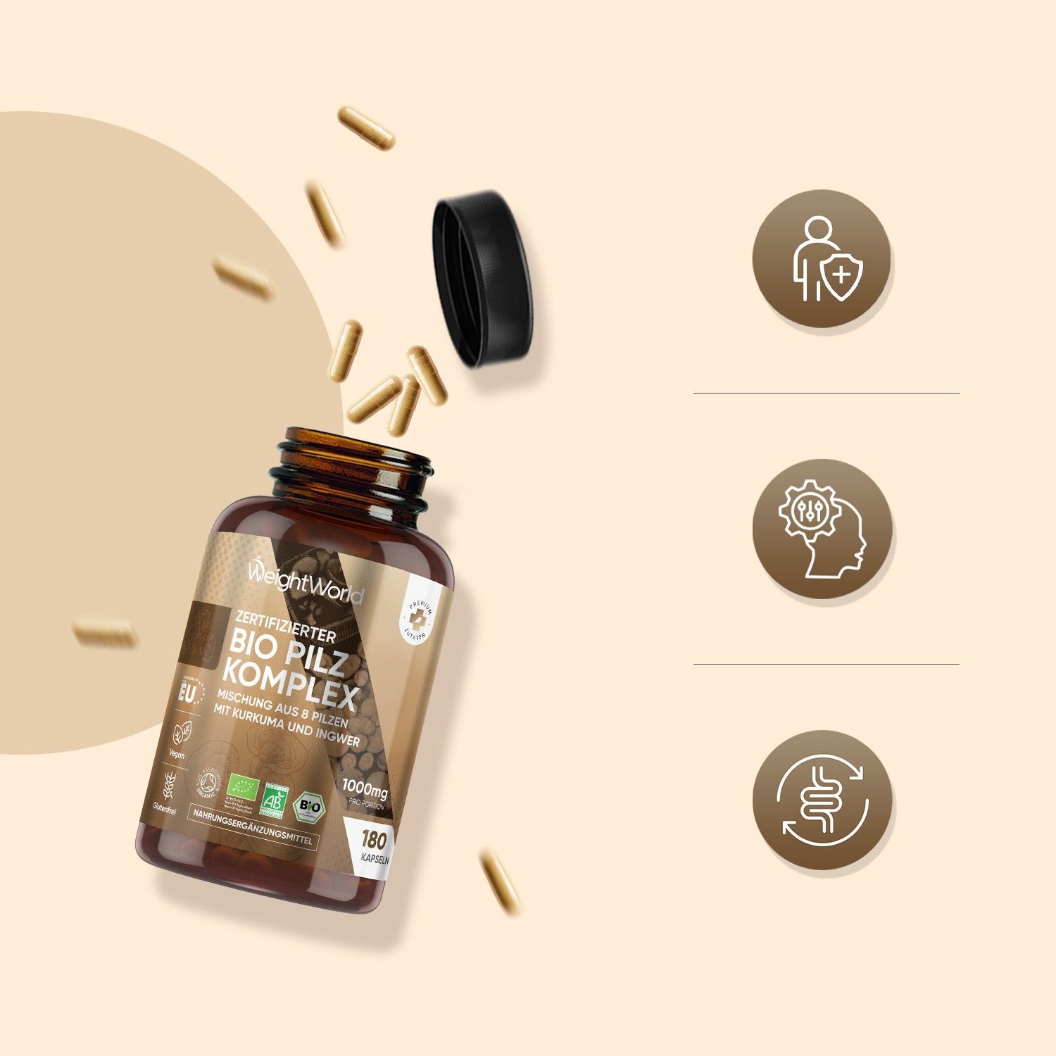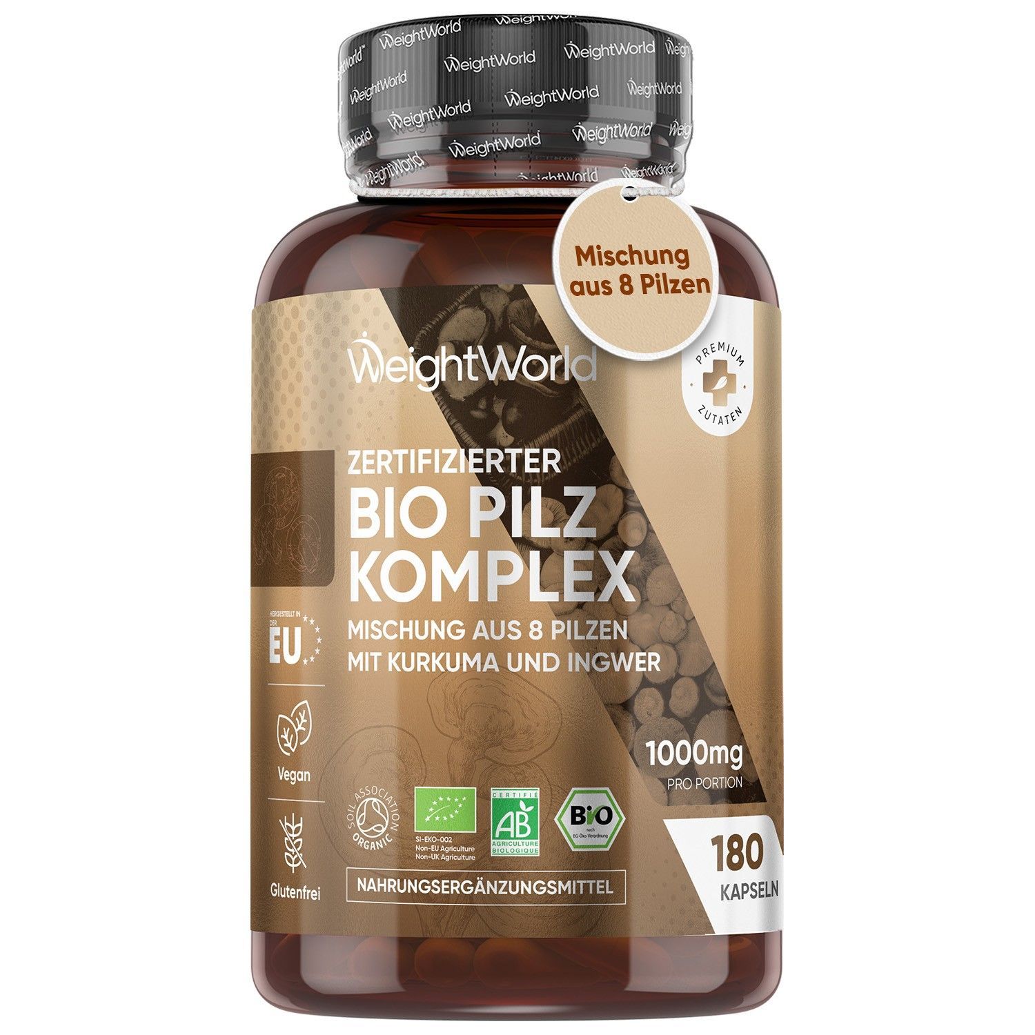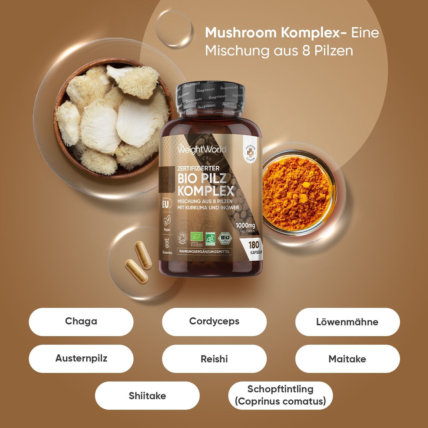 BIO Pilz Komplex mit 8 Pilzsorten - 180 Kapseln- 1000mg mit Löwenmähne Pilz, Reishi,