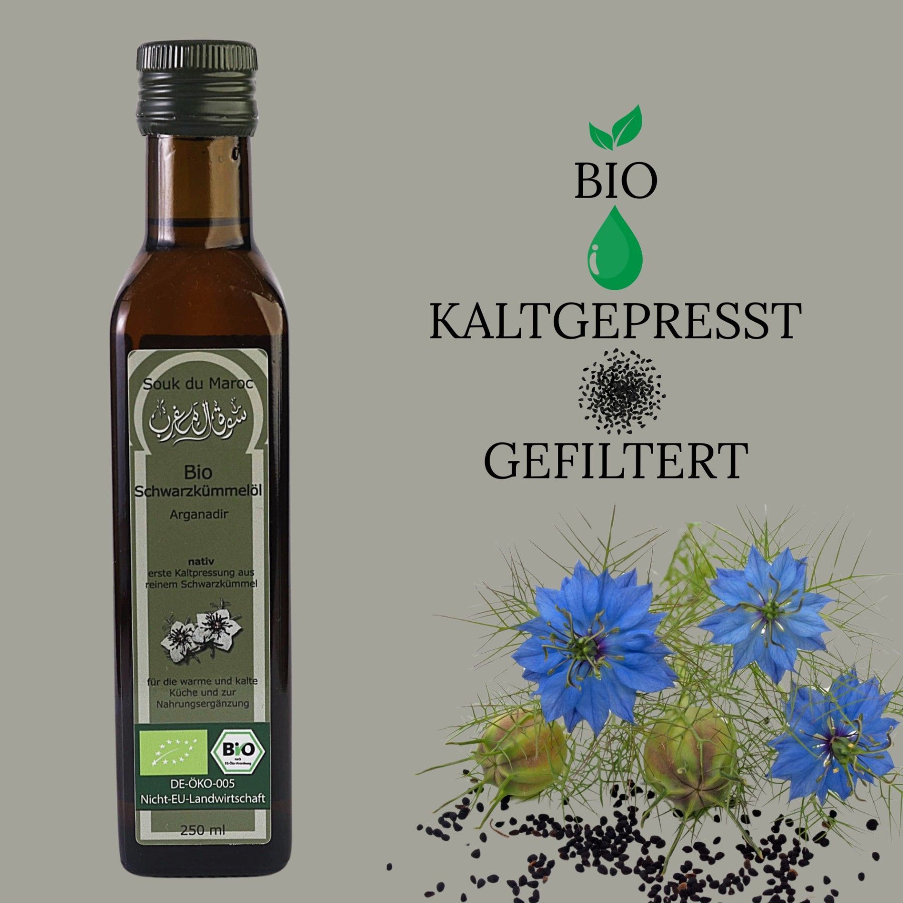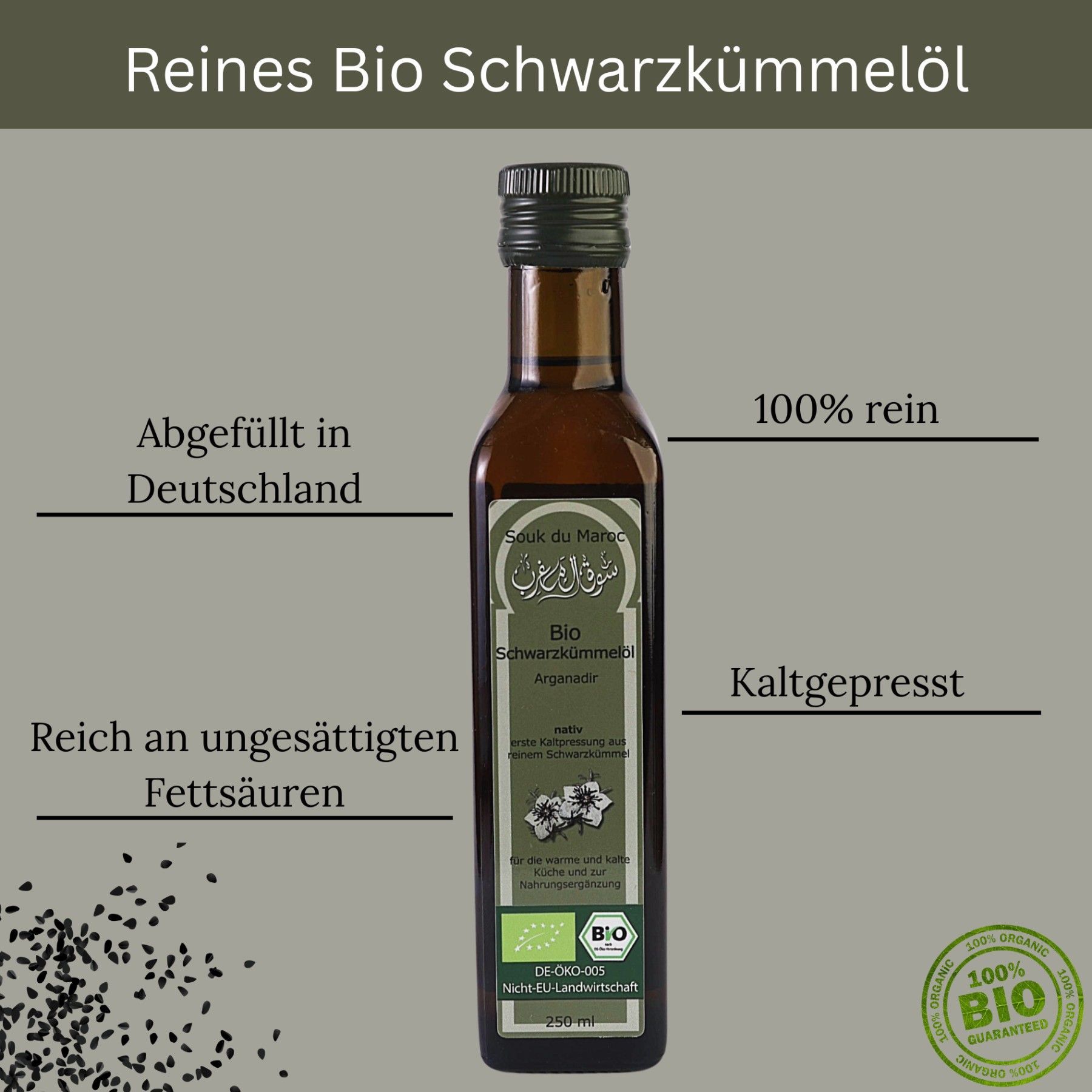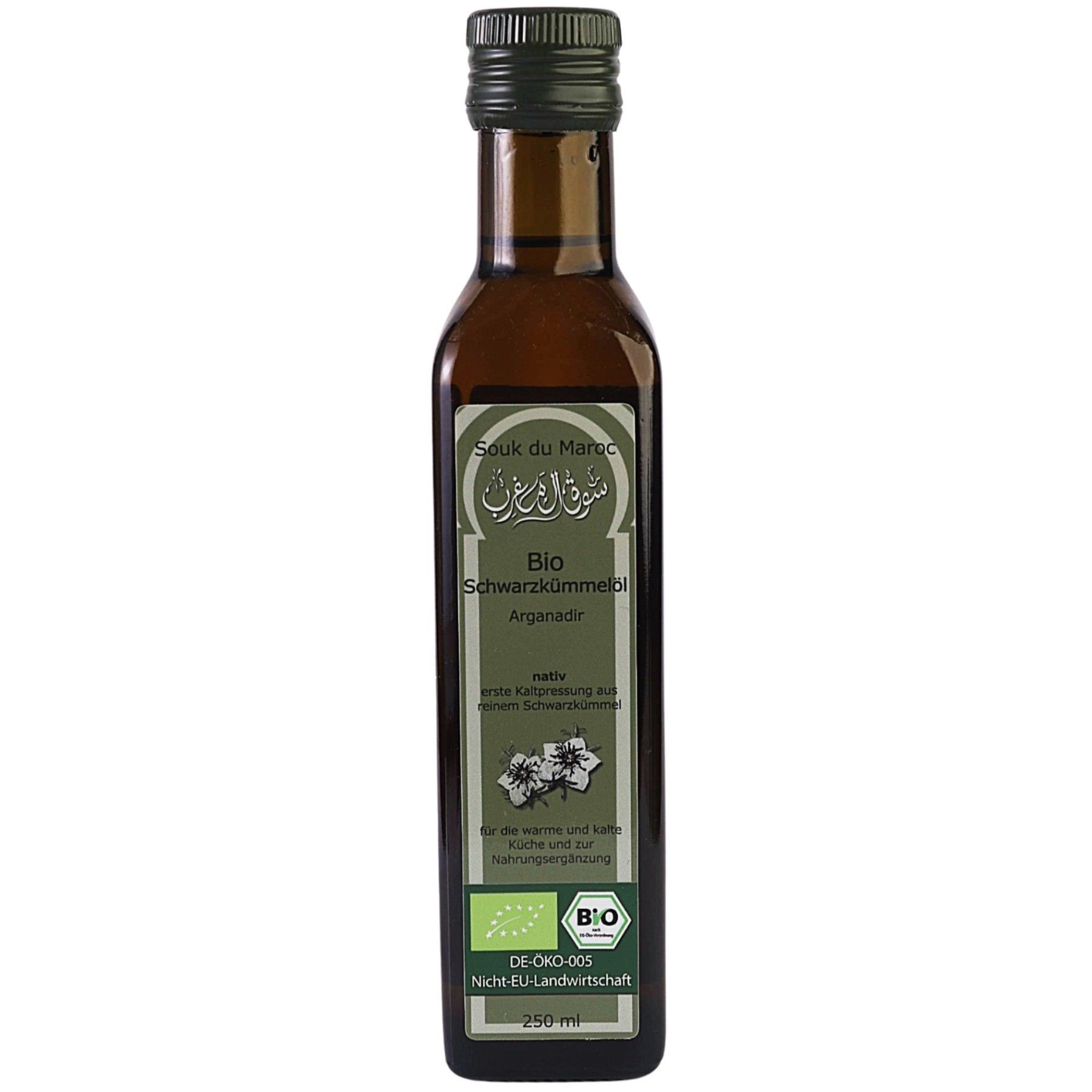 Bio Schwarzkümmel Öl – 250ml |100 % rein & kaltgepresst | Qualität aus Ägypten Unser hochwertiges Bio-Schwarzkümmelöl wird aus besten Nigella-Sativa-Samen in Ägypten gewonnen – kaltgepresst, gefiltert und frei von Zusatzstoffen. Es unterstützt Immunsystem, Haut und Haare und überzeugt durch mildes Aroma und höchste Reinheit. Ideal für den täglichen Genuss – pur oder als Ergänzung zu Speisen. Bio-zertifiziert DE-ÖKO-005 Inhalt: 250ml