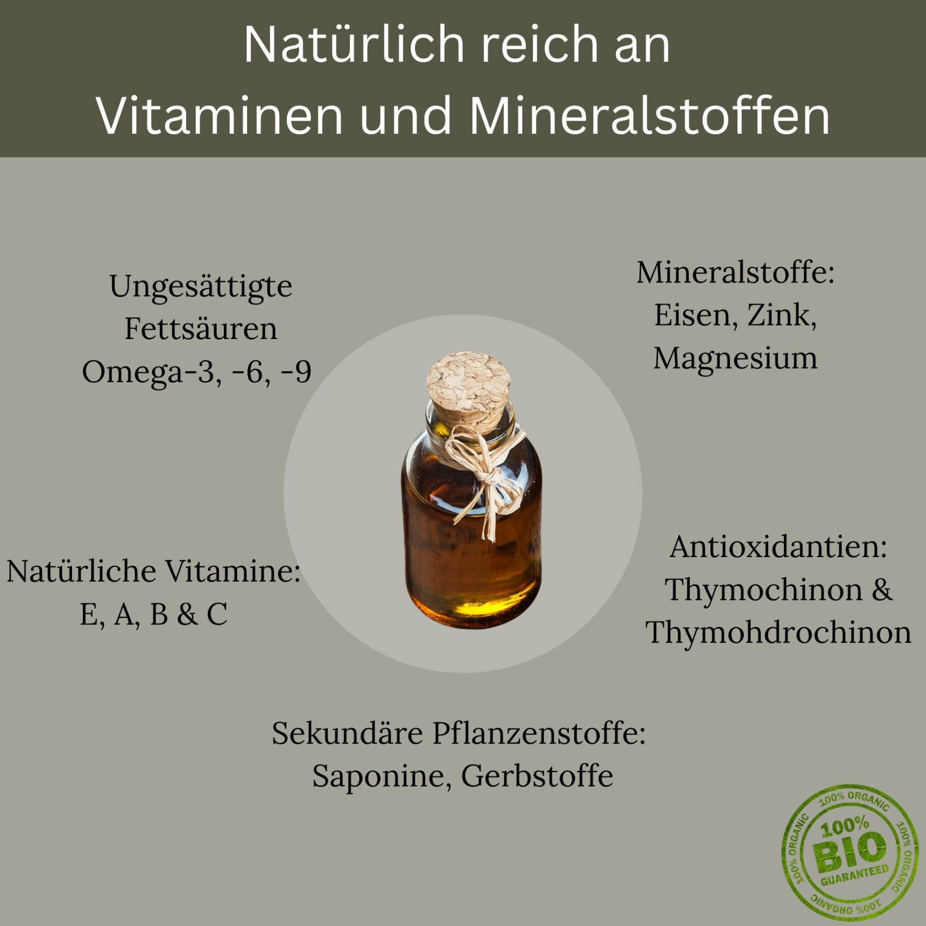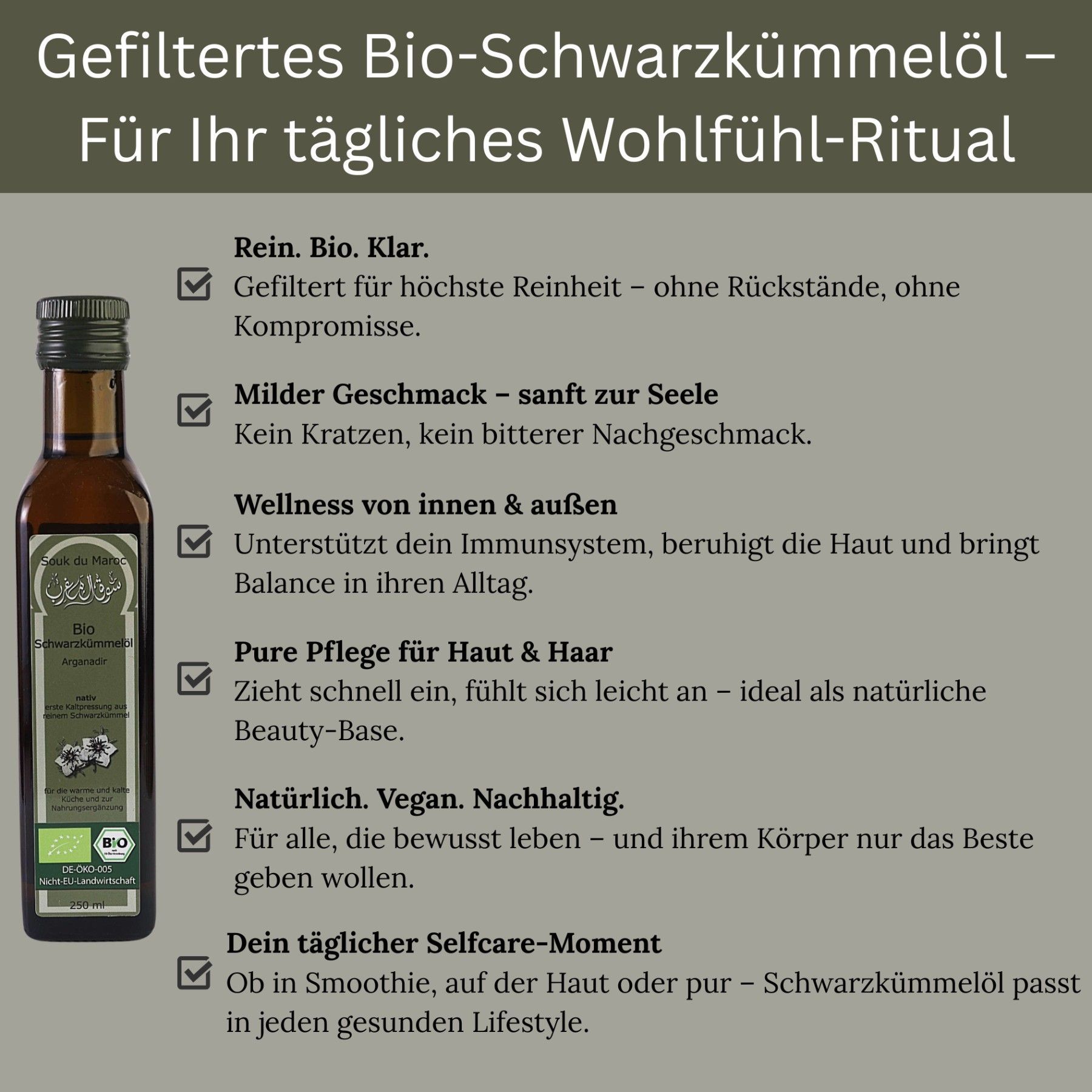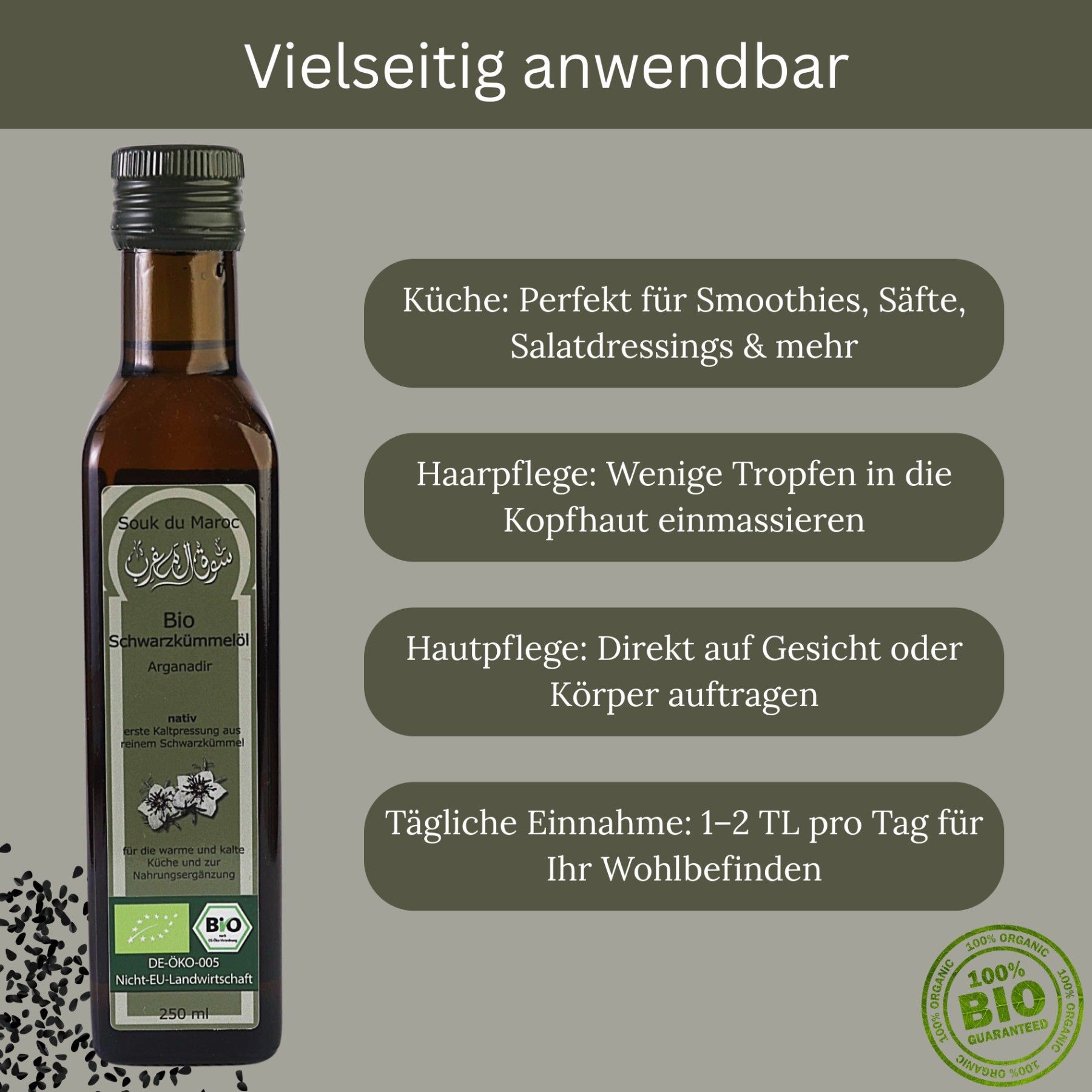 Bio Schwarzkümmel Öl – 250ml |100 % rein & kaltgepresst | Qualität aus Ägypten Unser hochwertiges Bio-Schwarzkümmelöl wird aus besten Nigella-Sativa-Samen in Ägypten gewonnen – kaltgepresst, gefiltert und frei von Zusatzstoffen. Es unterstützt Immunsystem, Haut und Haare und überzeugt durch mildes Aroma und höchste Reinheit. Ideal für den täglichen Genuss – pur oder als Ergänzung zu Speisen. Bio-zertifiziert DE-ÖKO-005 Inhalt: 250ml