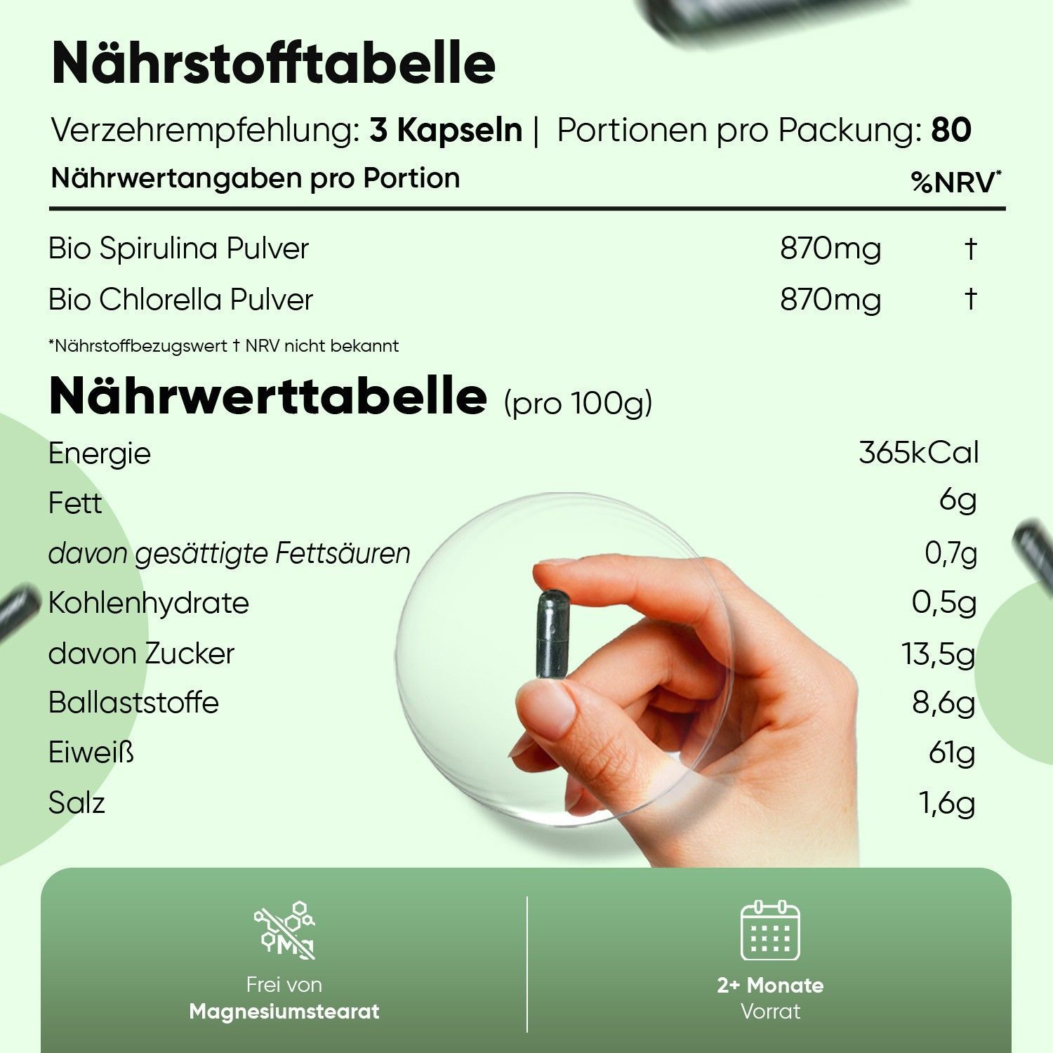 Bio Spirulina & Chlorella - 1740mg Pulver nur in 3 Kapseln - 240 Vegane Kapseln