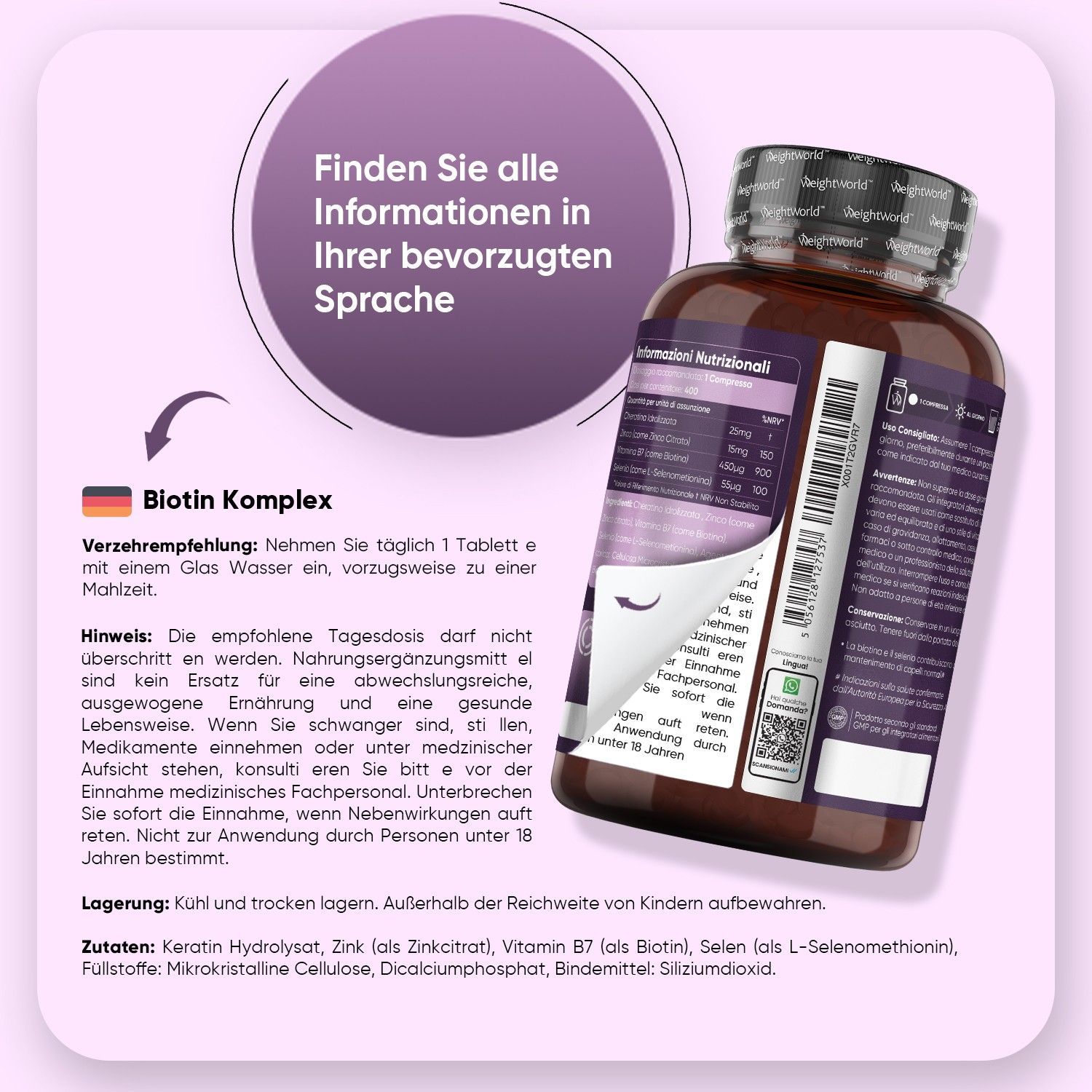 Biotin Komplex mit Keratin 25mg, Selen, Zink - 400 vegane Tabletten - 1+ Jahre Vorrat