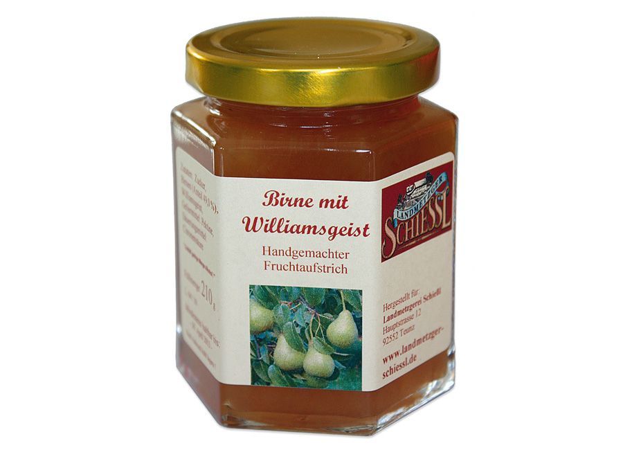 Die süß-fruchtige Birne, veredelt mit Williamsgeist, macht diesen Fruchtaufstrich zu etwas Besonderem. Ob auf warmem Toast, knusprigen Frühstücksbrötchen oder gar auf einem Omelett - Birne mit Williamsgeist ist immer ein Gaumenschmaus. Dieser Fruchtaufstrich besticht durch Farbe und Aroma gleicherma
