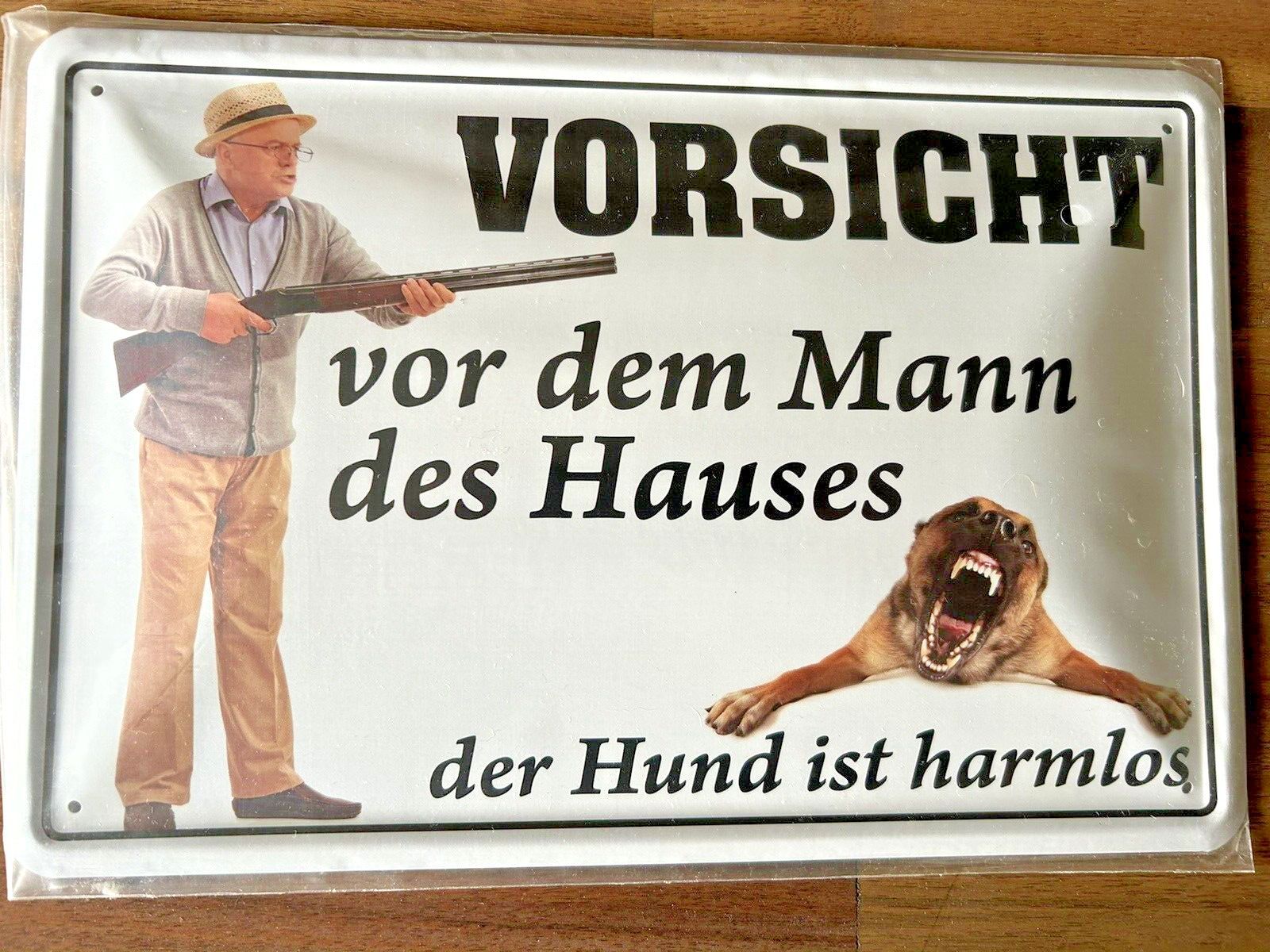Kaufen sie hier dieses coole, gewölbte und originelle Blechschild: Vorsicht vor dem Mann des Hauses - der Hund ist harmlos in der Grösse 20 cm x 30 cm - absolut cool + originell ! vorgebohrte Löcher Neuware, ovp