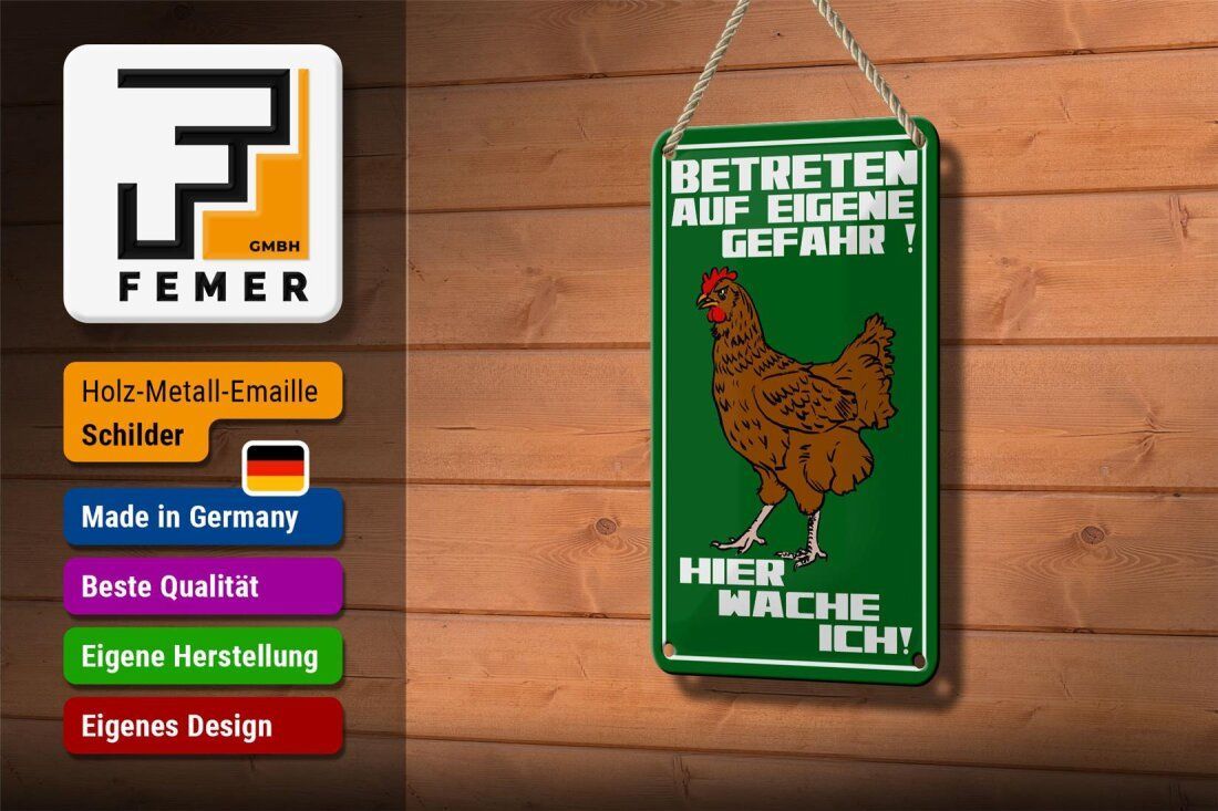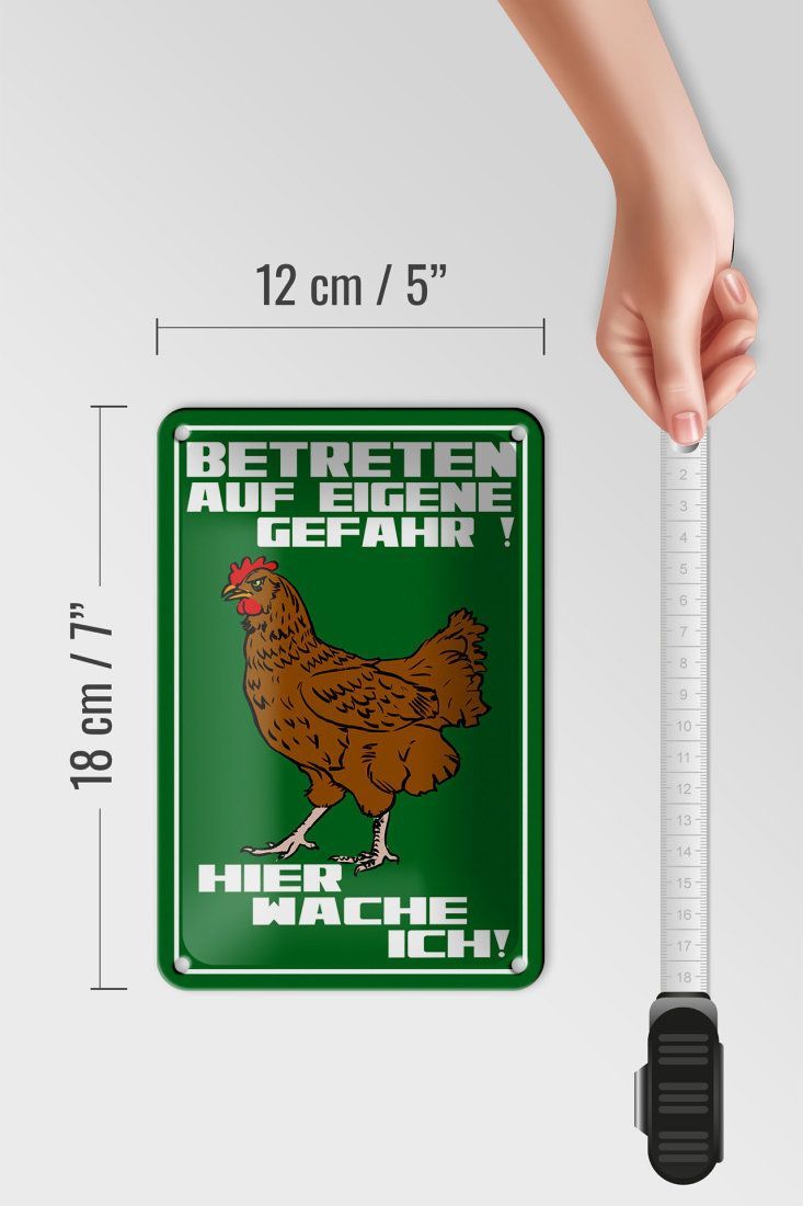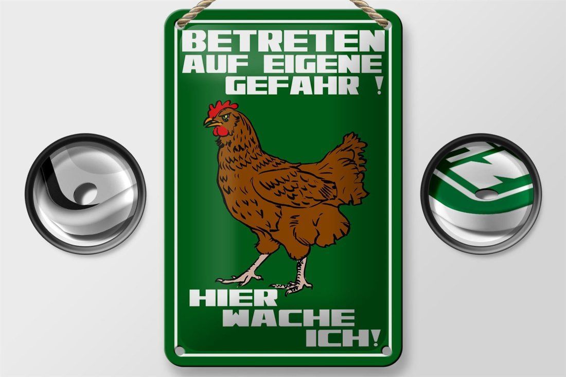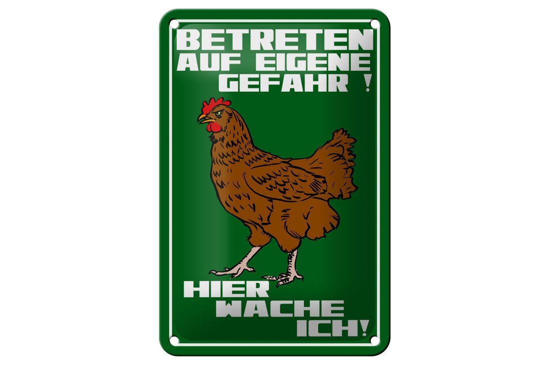 Blechschild "Betreten auf eigene Gefahr Hier wache ich" Hahn - 12x18 cm grün gewölbt