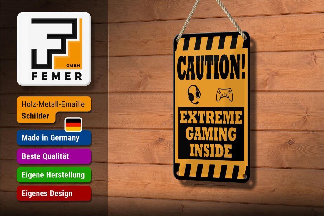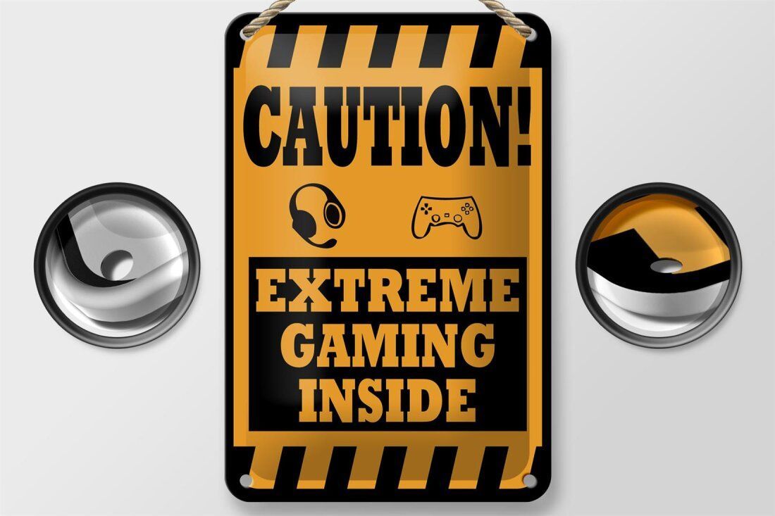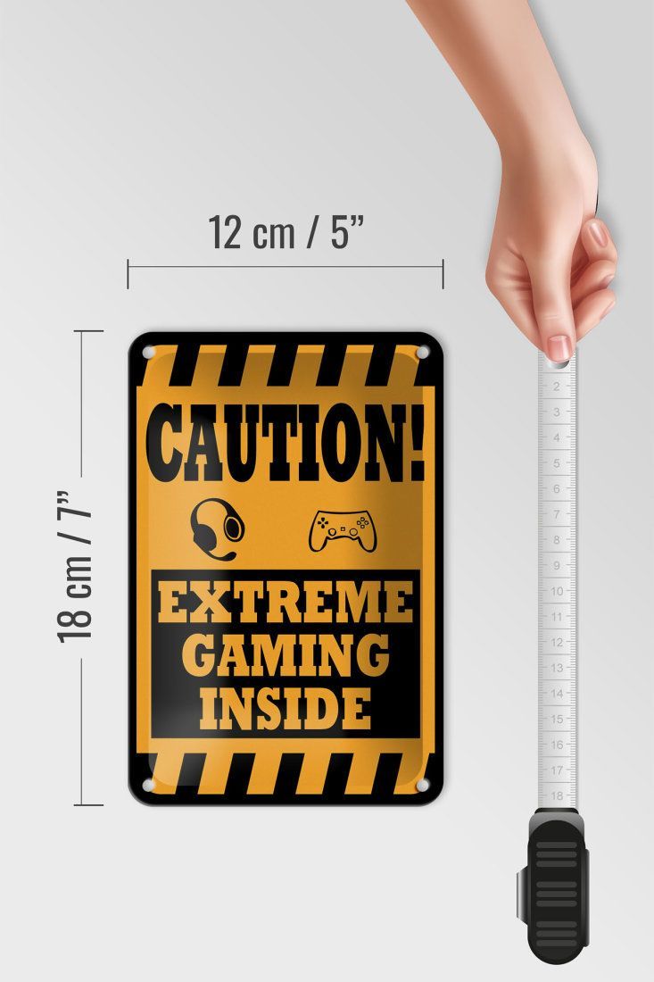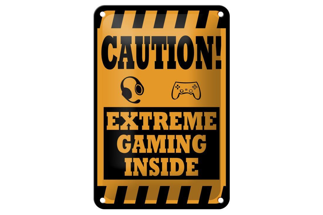 Blechschild "Caution! Extreme Gaming Inside" 12x18 cm gelb schwarz gewölbt