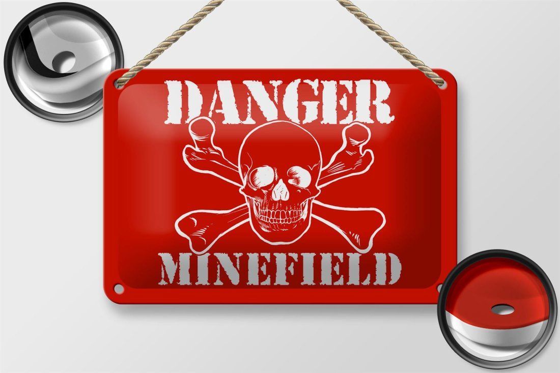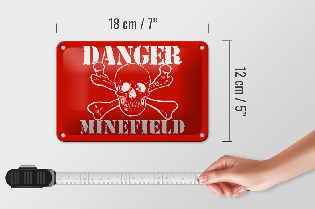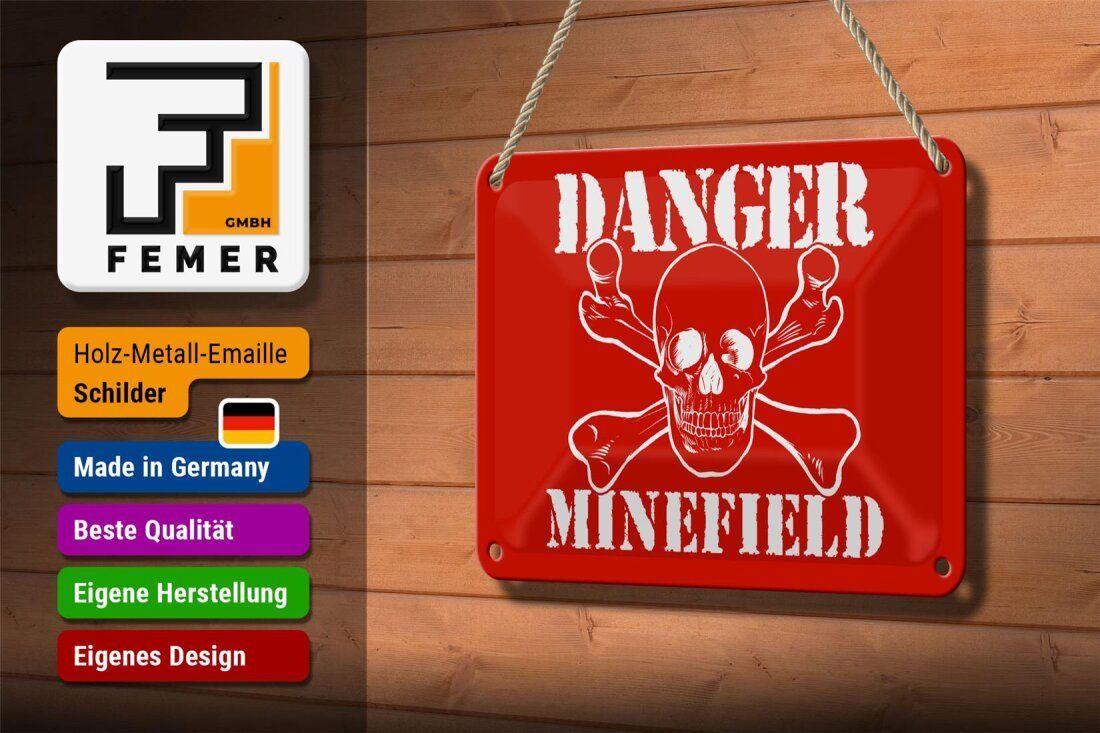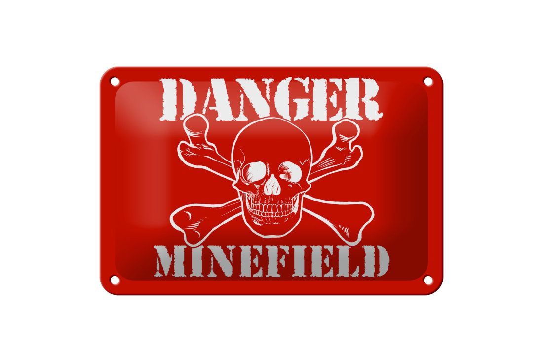 Blechschild "Danger Minefield" Totenkopf 18x12cm rot gewölbt