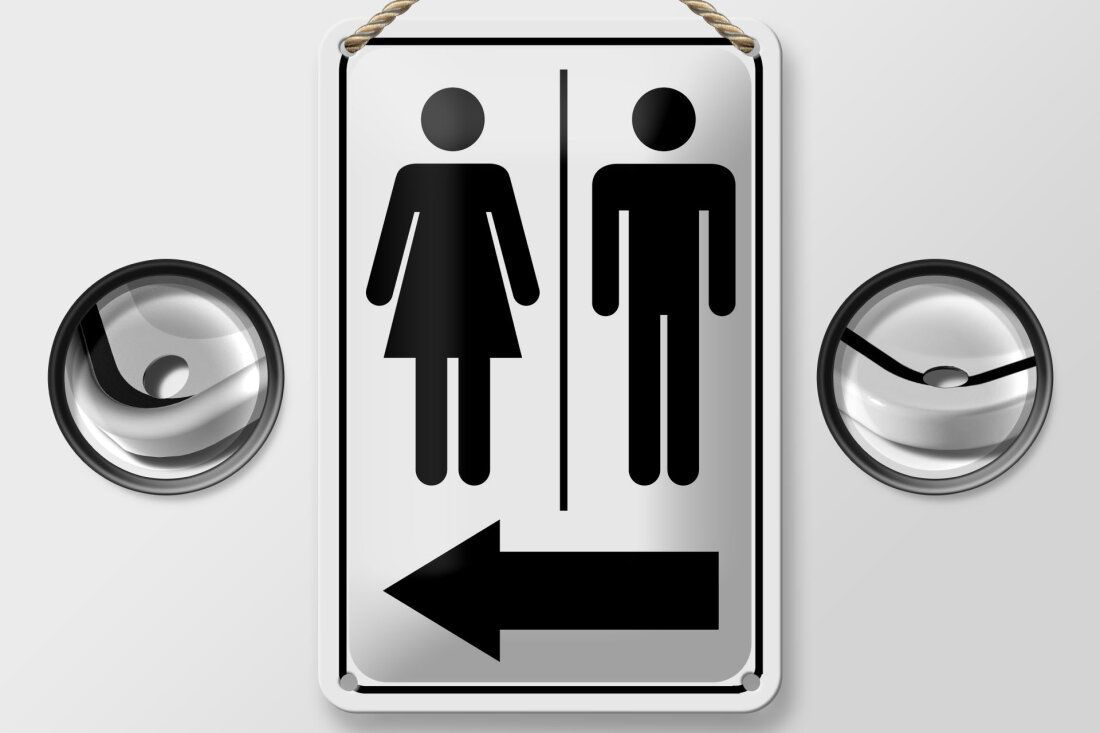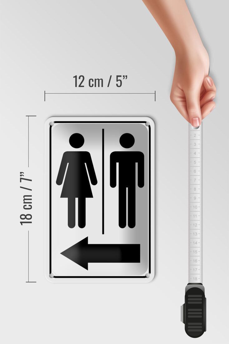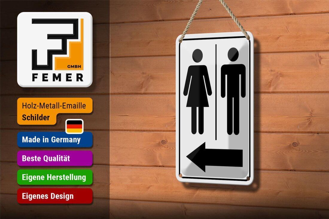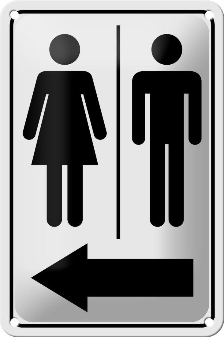 Blechschild Hinweis Toilettenfiguren Pfeil links 12x18cm schwarz weiß gewölbt