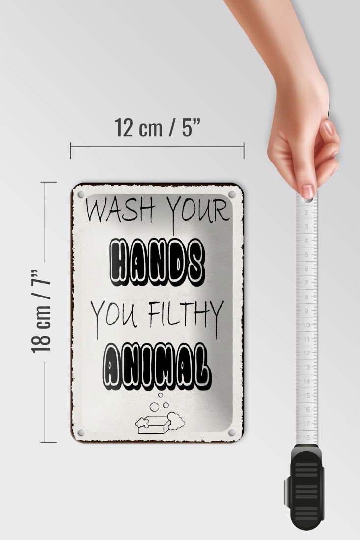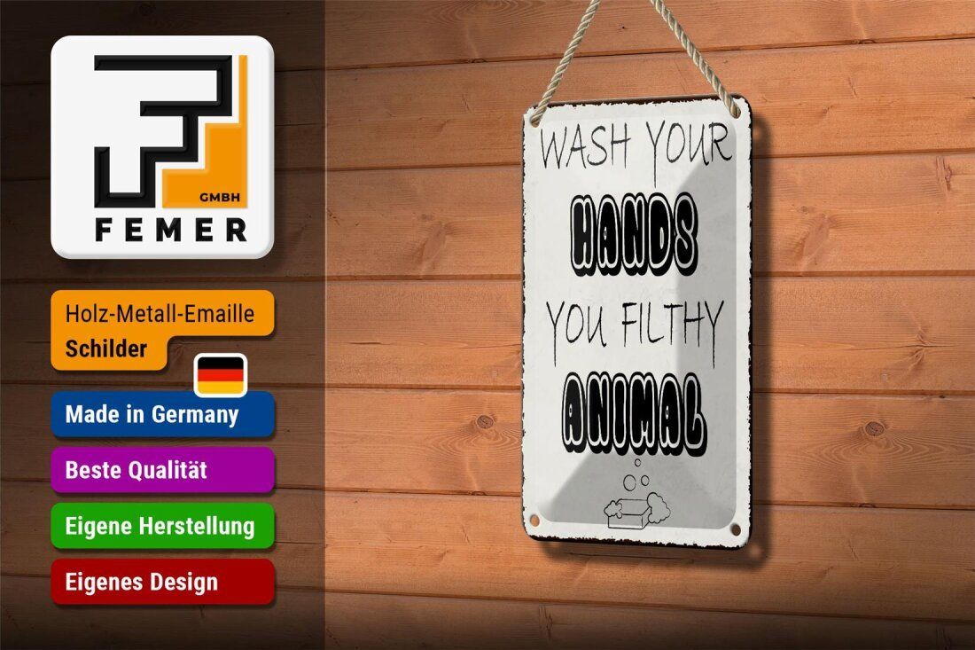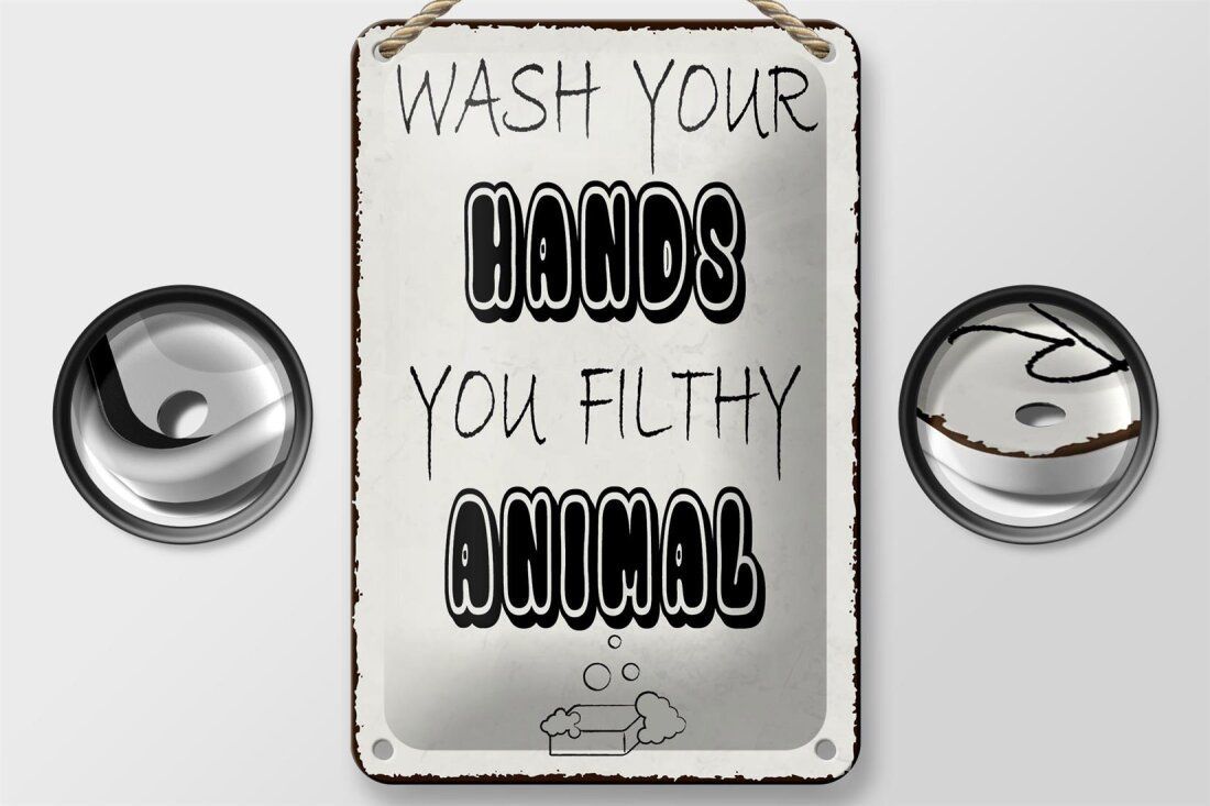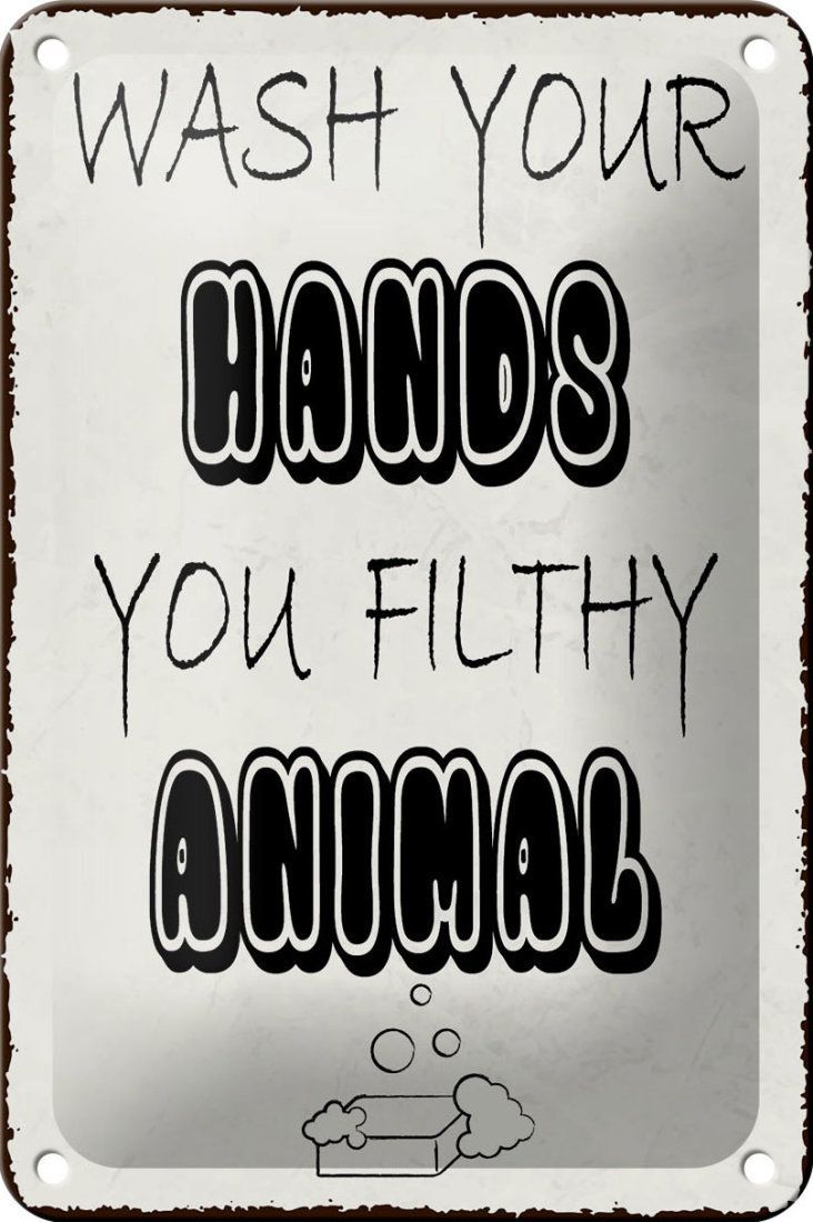 Blechschild Hinweis „Wash your hands you filthy animal“ 12x18cm weiß gewölbt