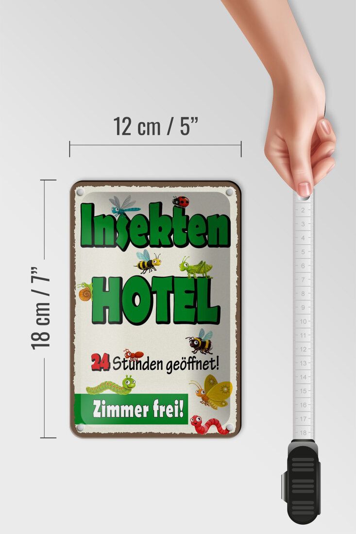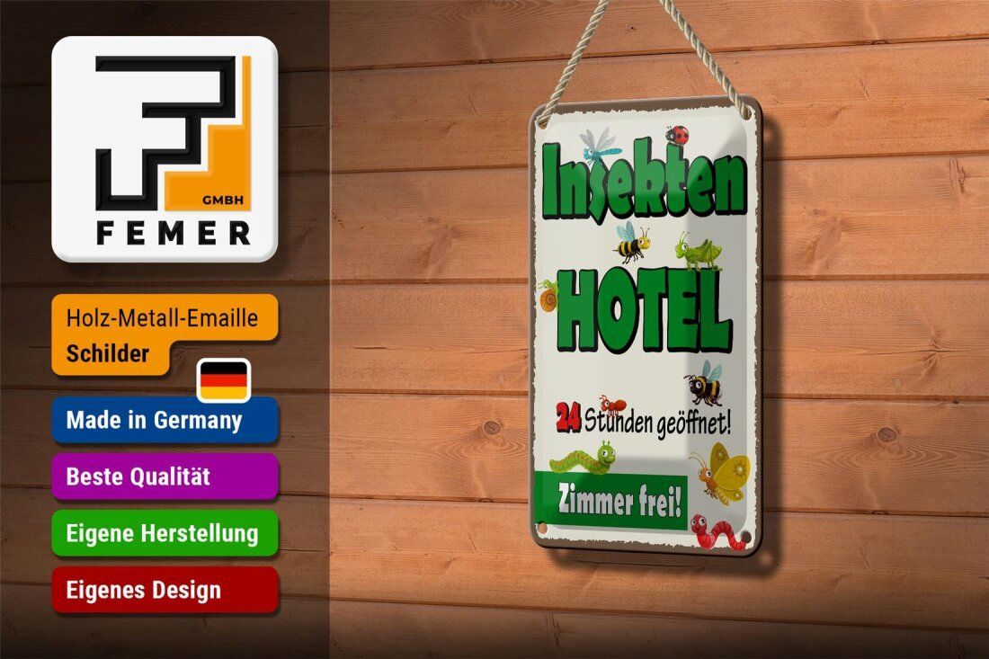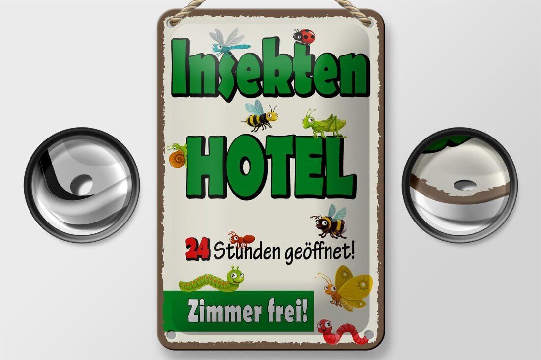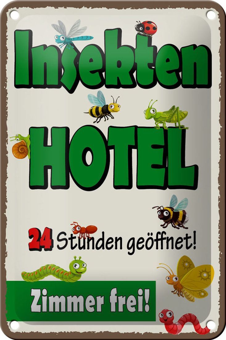 Blechschild Insektenhotel - Zimmer frei! - 12x18 cm weiß blau gewölbt