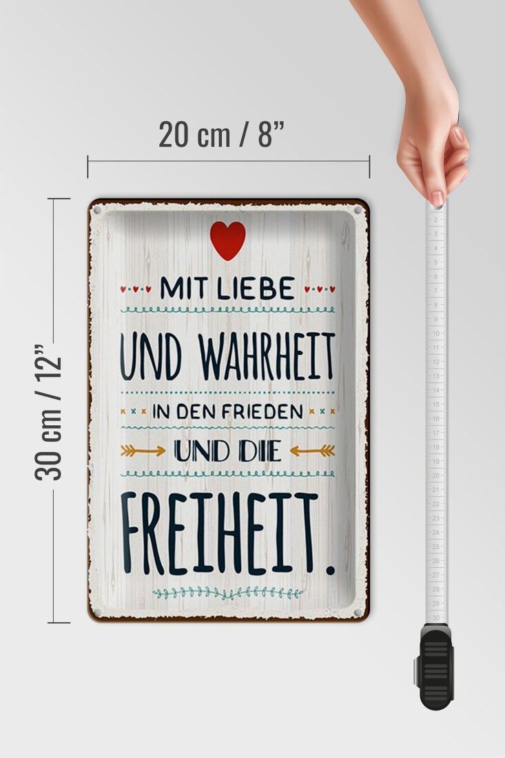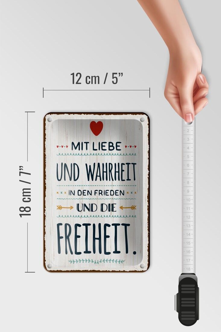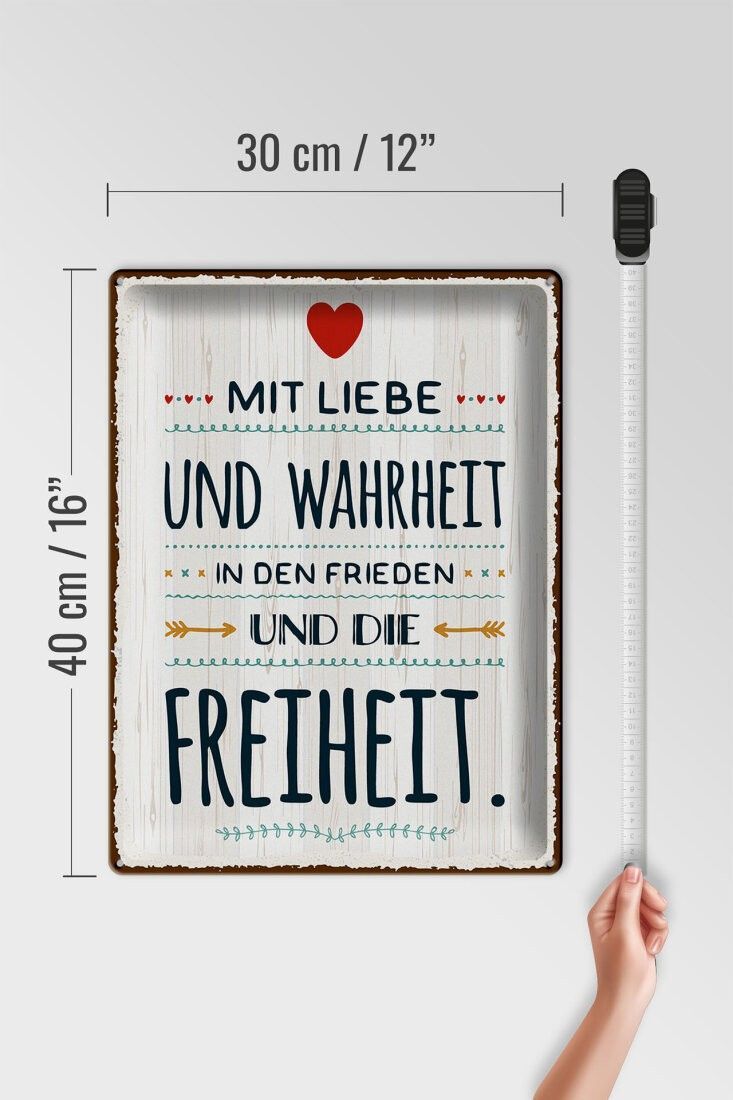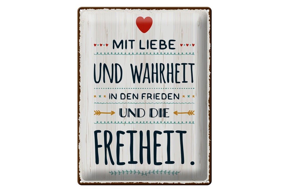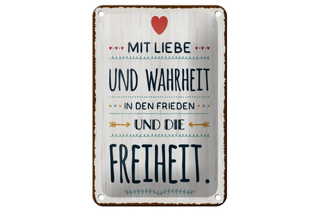 Blechschild Mit Liebe und Wahrheit in den Frieden, 3 vers. Größen, Spruch