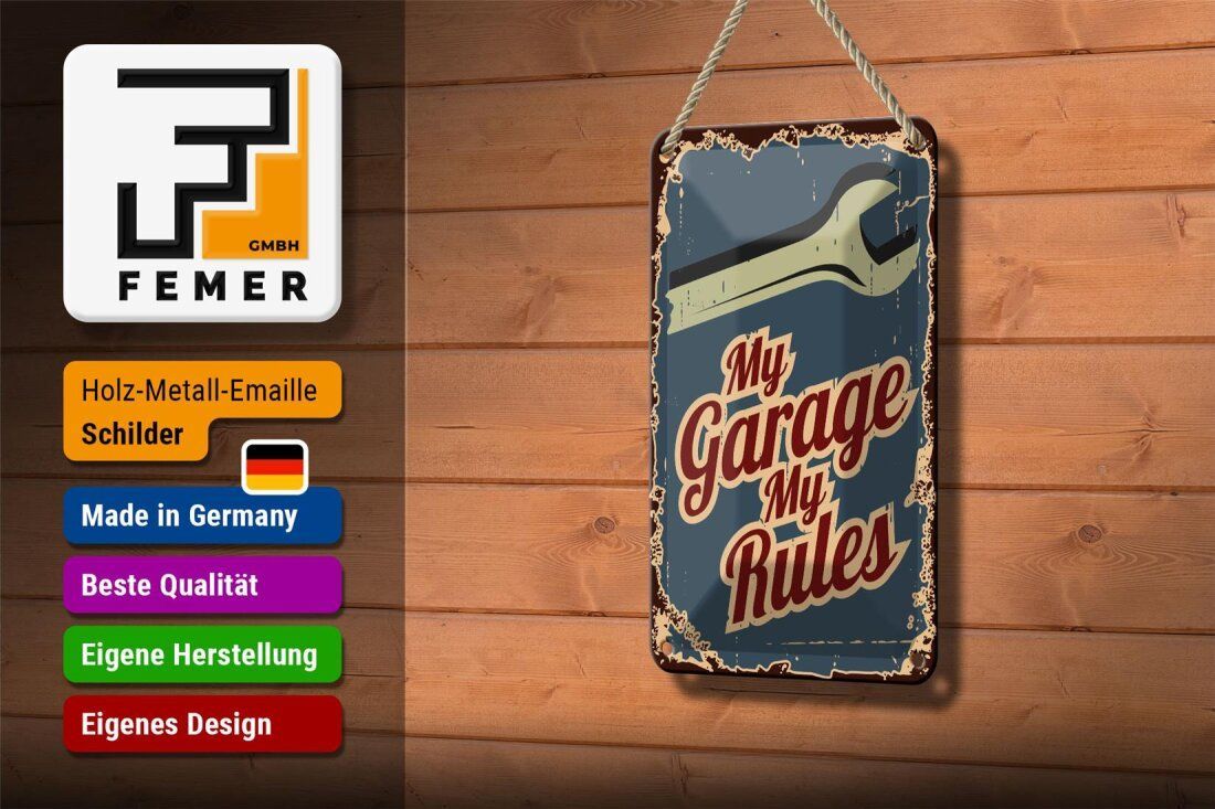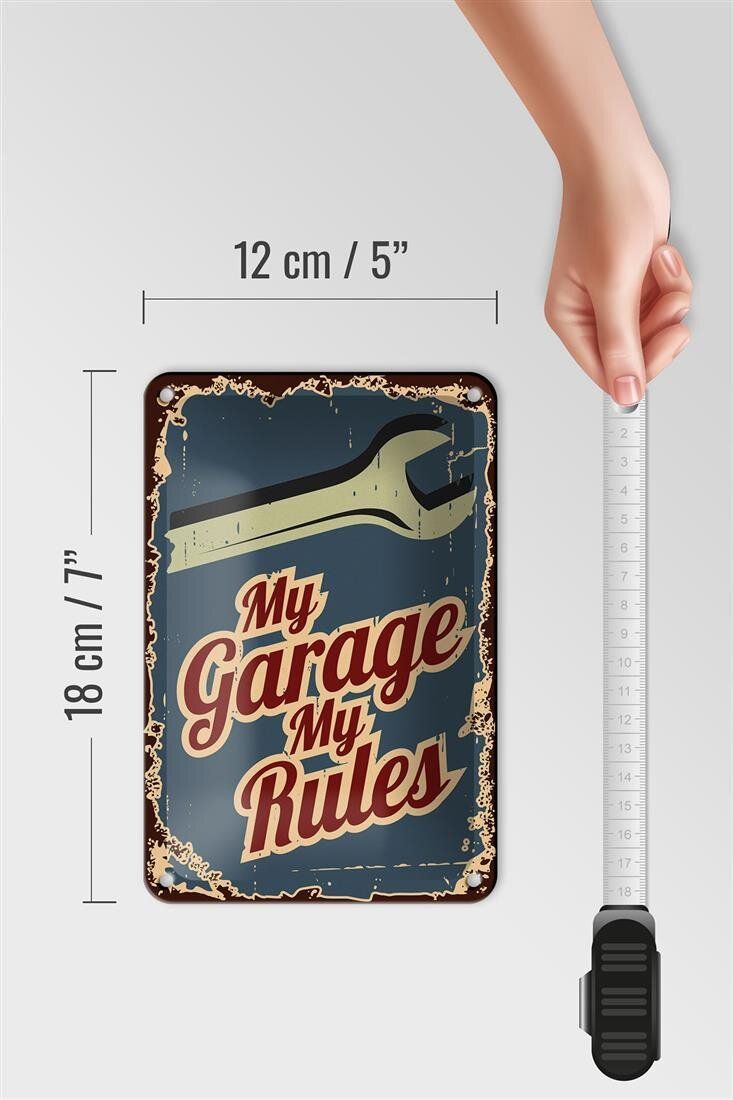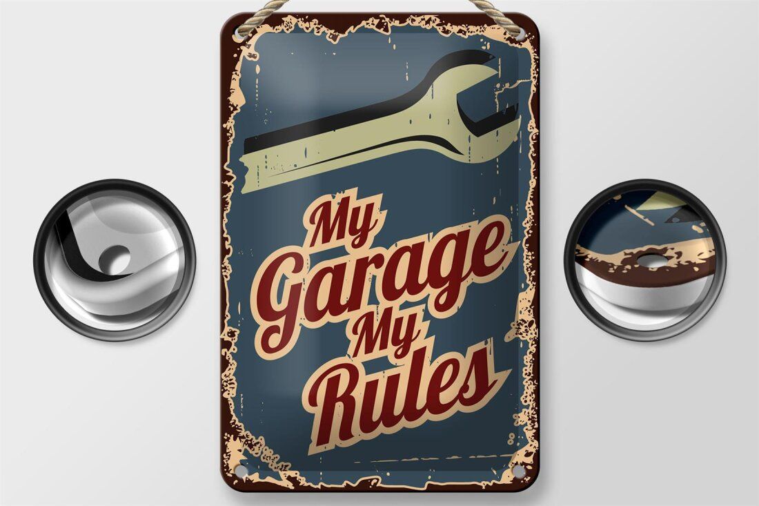 Blechschild My Garage My Rules - 12x18 cm Blau/Beige/Rot Vintage-Look gewölbt