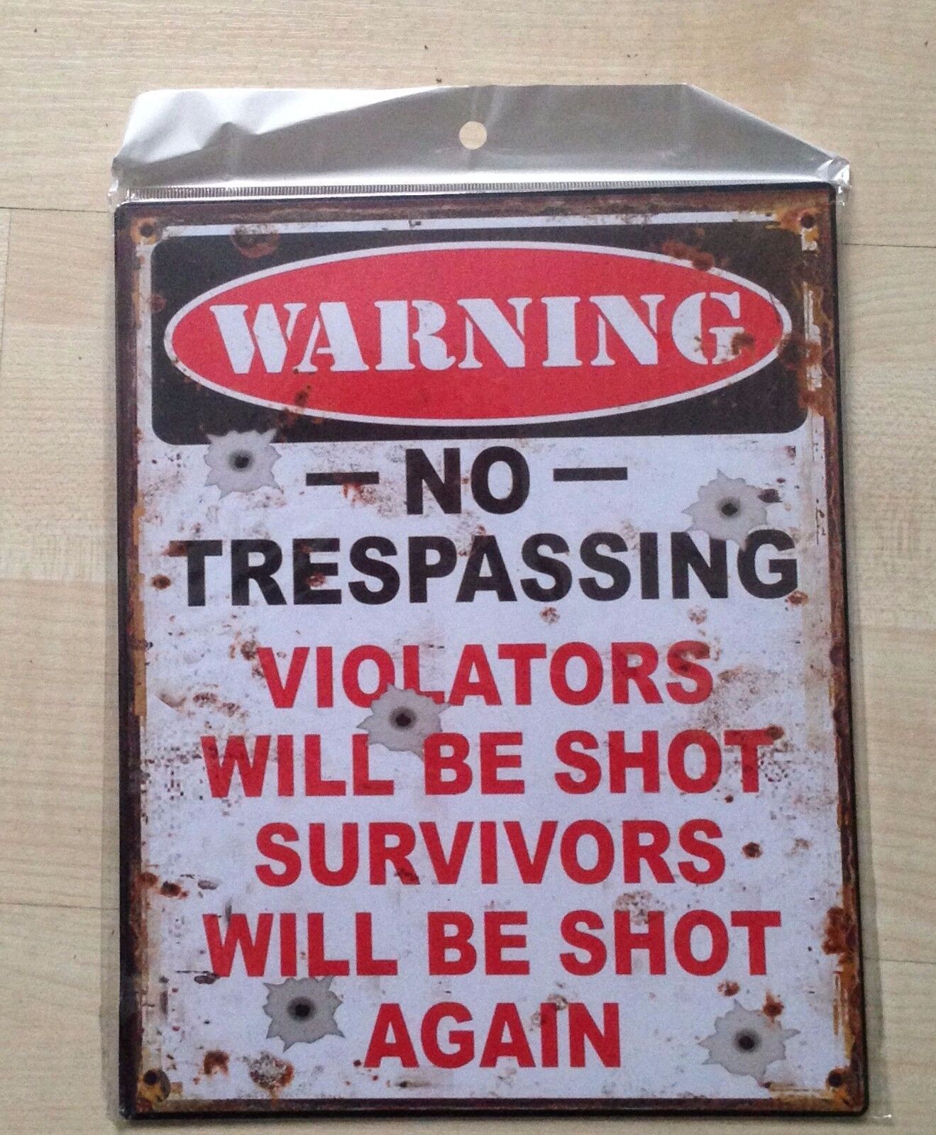Kaufen sie hier dieses originelle Retro Blechschild im Shabby Style: Warning - No Trespassing - Violators will be shot, survivors will be shot again ! Grösse: 20x25 vorgebohrte Löcher Neuware, ovp - incl. Versand Abholung in unserem Ladengeschaeft Retro World in 73563 Mögglingen - Lauterstrasse 27 m
