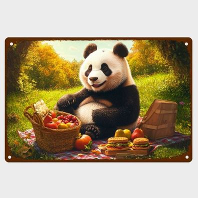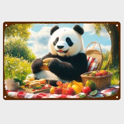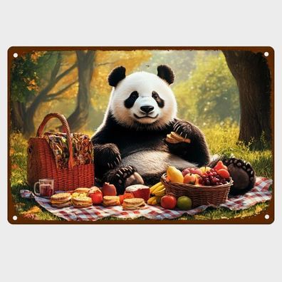 Blechschild Panda Bär beim Picknick Metallschild Nostalgie Vintage Retro TEL2113