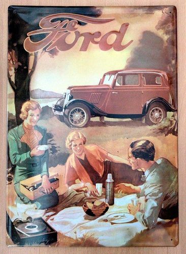Blechschild Picknick mit Ford-Oldtimer vermutlich aus den 1980er Jahren Das Blechschild hat eine Höhe von 48 cm und eine Breite von 35 cm. Das Blechschild ist leicht gewölbt nach innen. Die Seitenkanten sind nach hinten umgelegt. In jeder Ecke befindet sich ein Loch zur Befestigung. Da es sich um ei