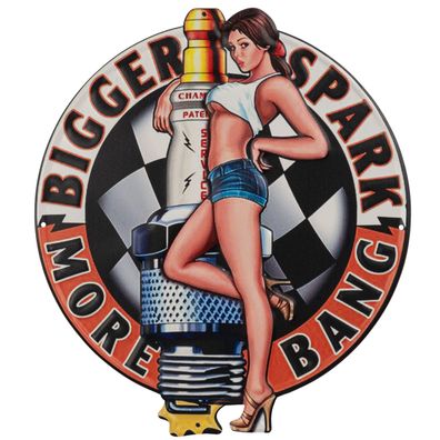 Blechschild 35 x 40 cm Zündkerze Pin Up Frau Rennen Auto Motor Retro Vintage Tin