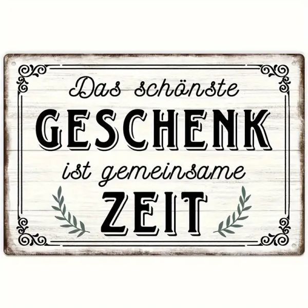 Blechschild Das schönste Geschenk ist gemeinsame Zeit 30x20 cm Das Blechschild besteht aus Aluminium. Dadurch ist es sehr stabil und nicht zu leicht. Es hat keine scharfen Kanten und die Ecken sind abgerundet. Es sind 4 Löcher zu Wandbefestigung vorgebohrt