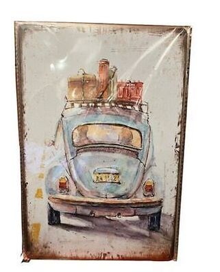 Blechschild VW Käfer mit Dachgepäckträger u Koffer Vintage Metallschild TEL3105