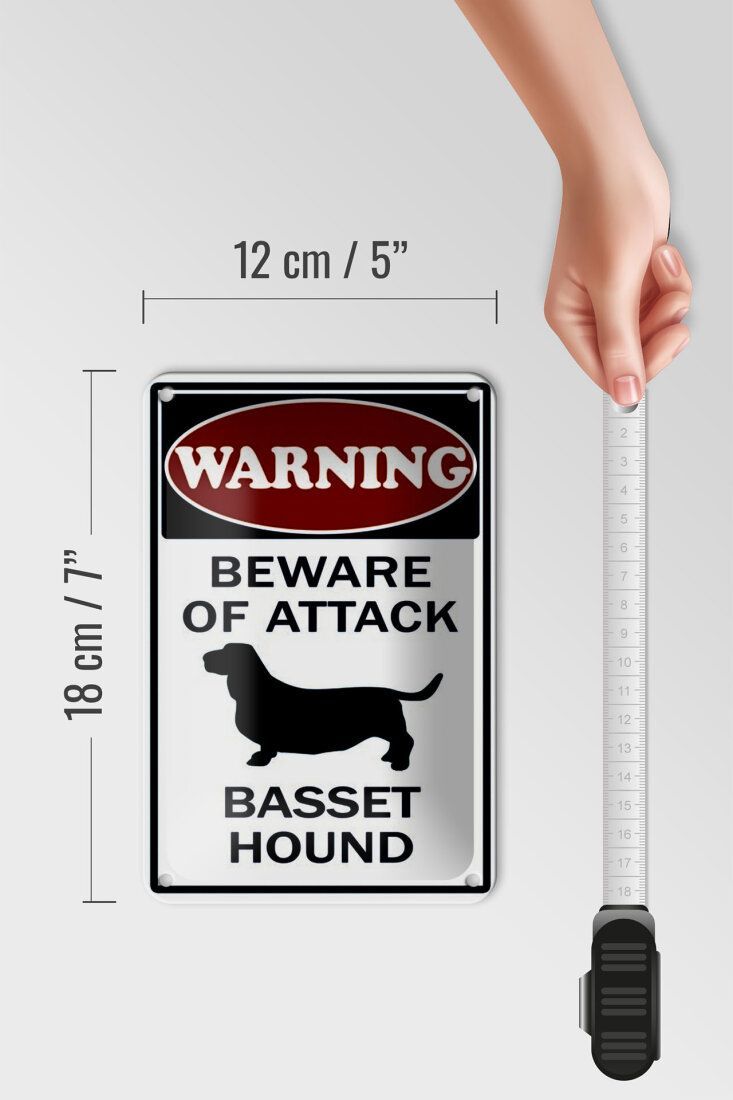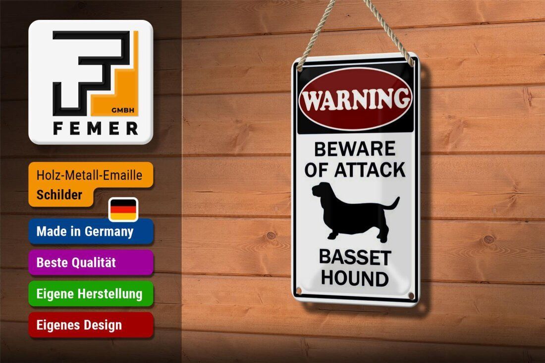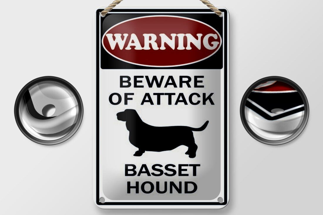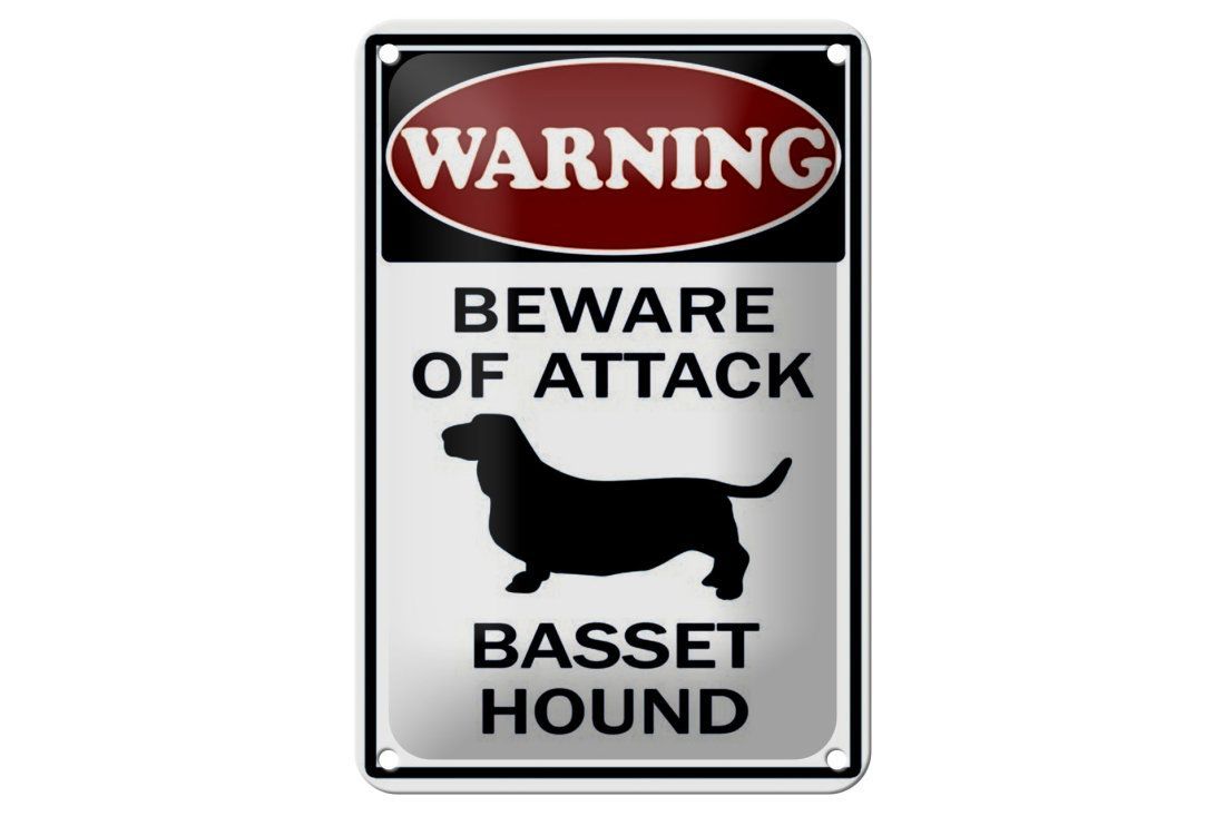 Blechschild "Warning beware of attack Basset Hound" - 12x18 cm gewölbt