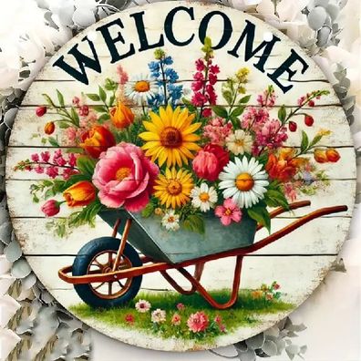 • Blechschild rund Welcome Garten Blumen Nostalgie Vintage Metallschild TEL2306