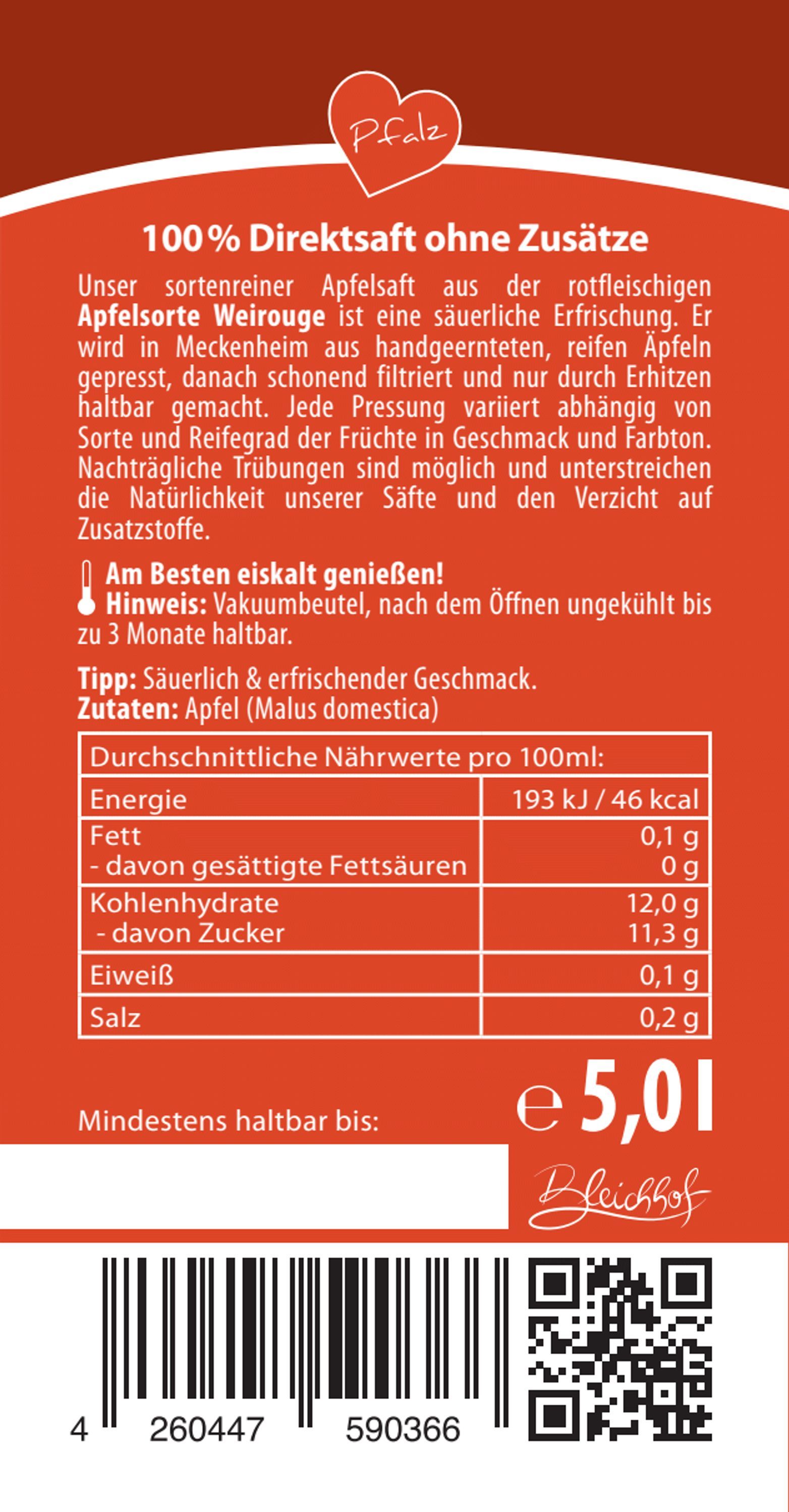 Bleichhof Apfelsaft Weirouge - 100% Direktsaft, Bag-in-Box (2x 5l Saftbox)