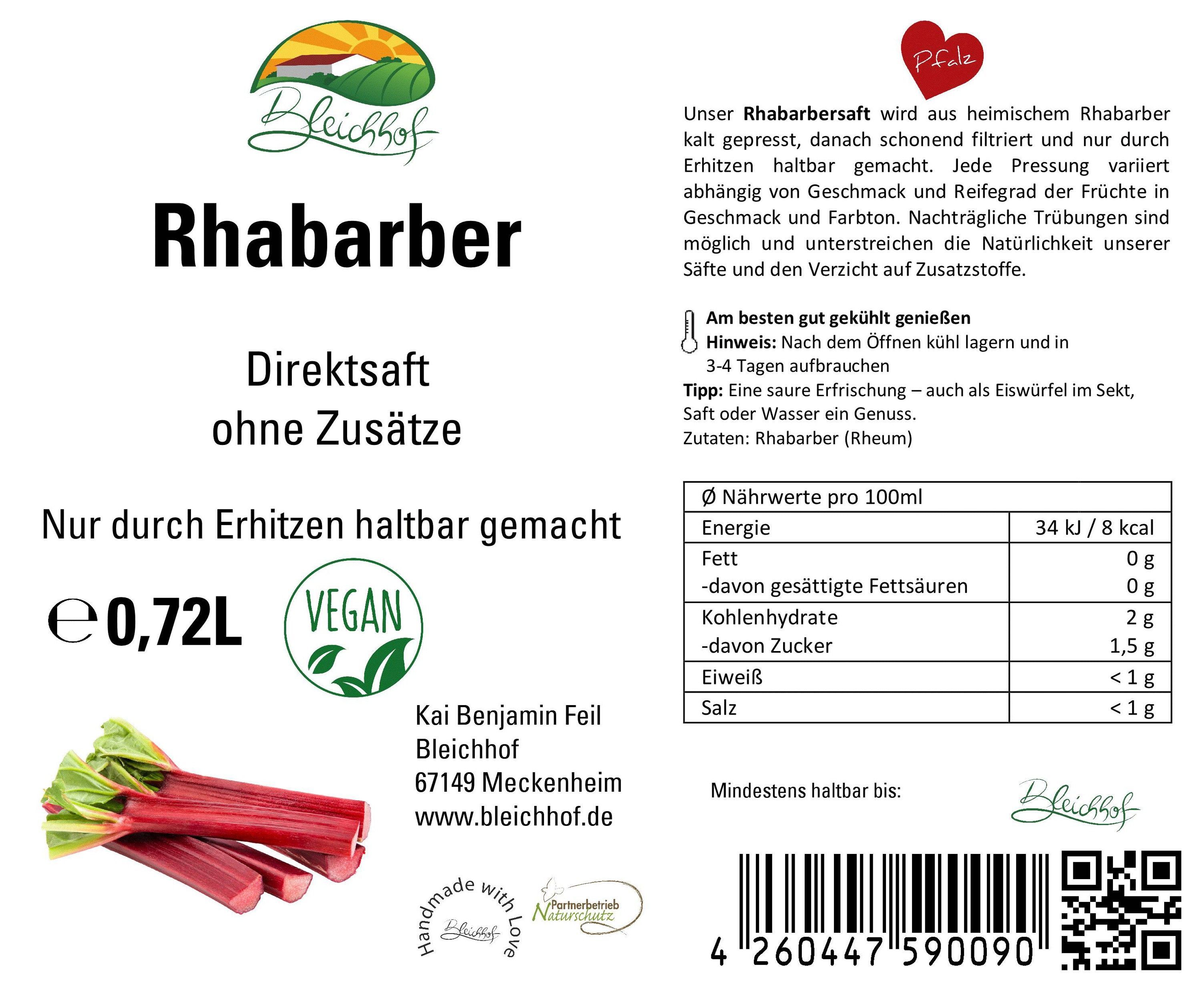 Bleichhof Rhabarbersaft - 100% Direktsaft, vegan (6x 0,72l)