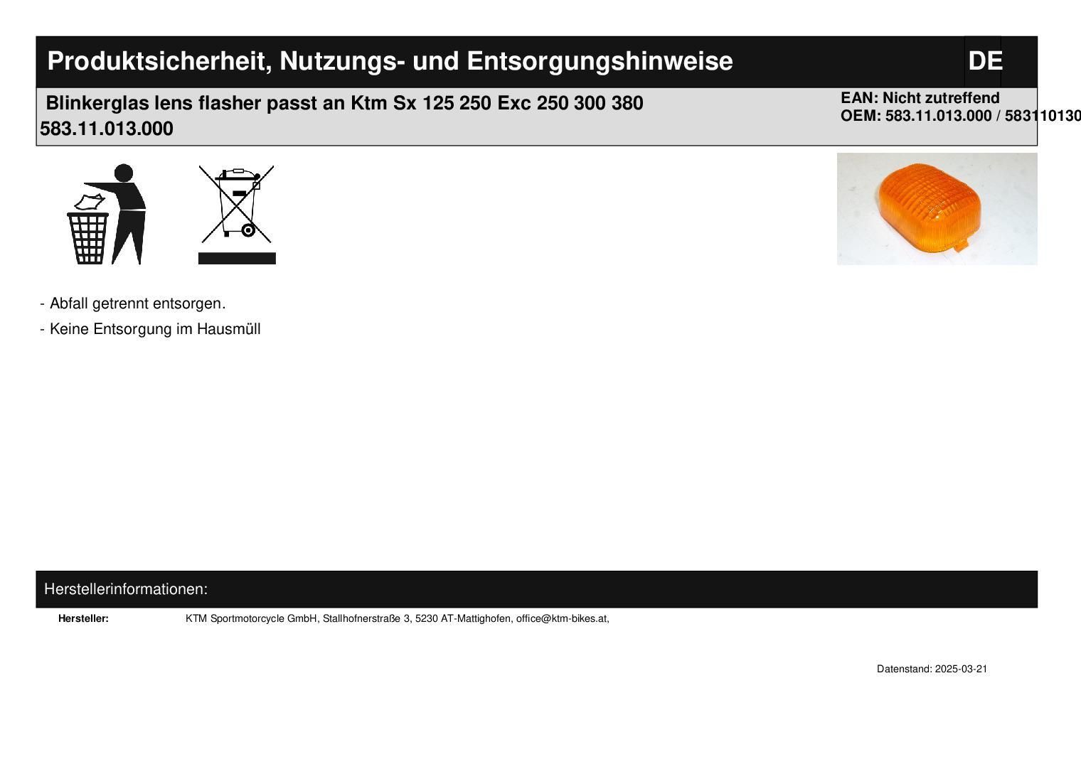 Blinkerglas lens flasher passt an Ktm Sx 125 250 Exc 250 300 380 583.11.013.000 In dieser Auktion gibt es folgenden Artikel zu kaufen: Blinkerglas (siehe Foto) Modell: passend für KTM SX 125 Bj.: 96 - 97 SX 250 Bj.: 96 - 97 EXC 300 Bj.: 96 - 99 EXC 125 Bj.: 97 - 98 EXC 200 Bj.: 96 - 98 Lieferumfang: