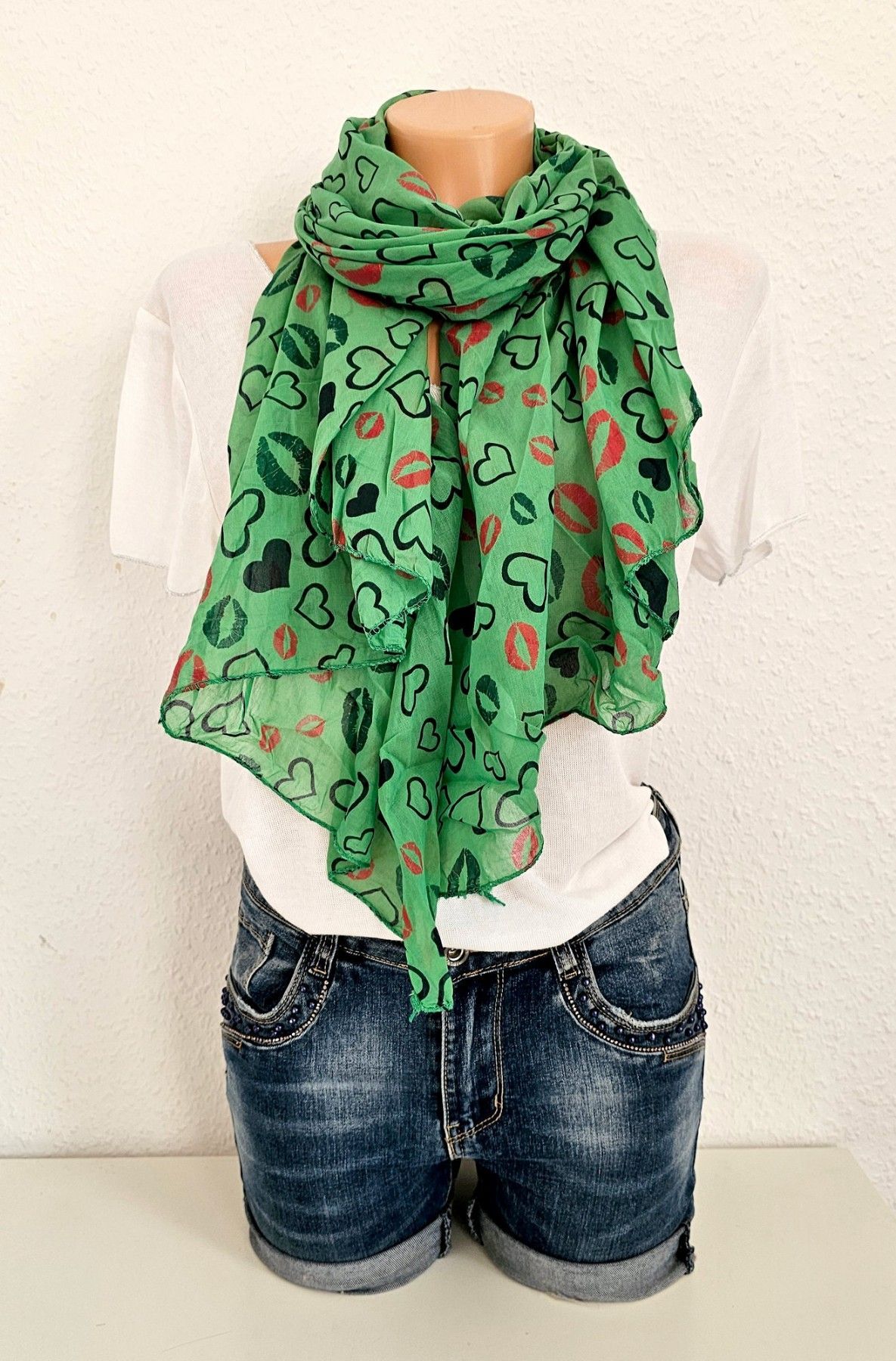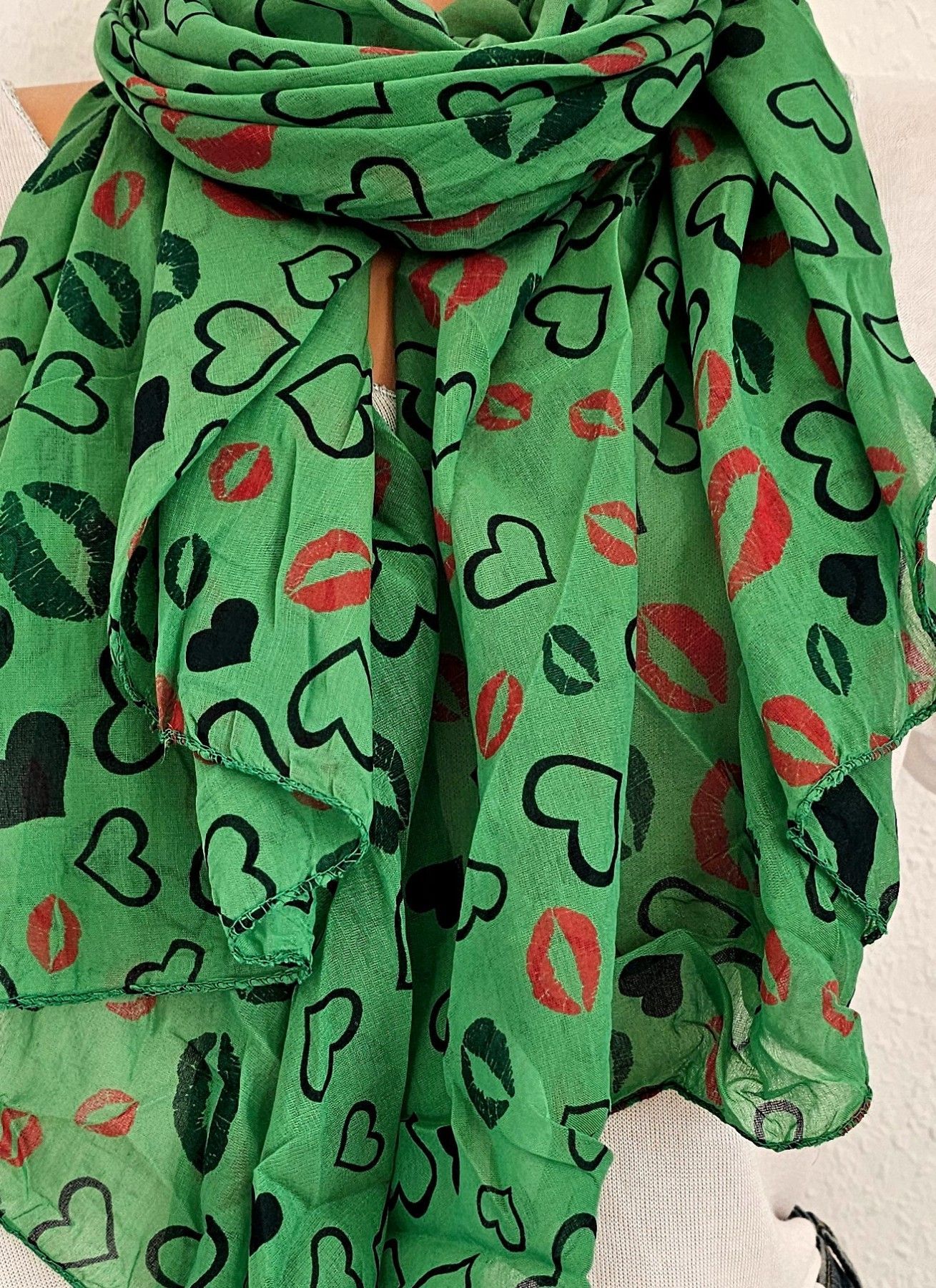 Blogger Italy Schal Tuch Halstuch Seide/ Baumw. asymetrisch Herzen/ Lippen Grün