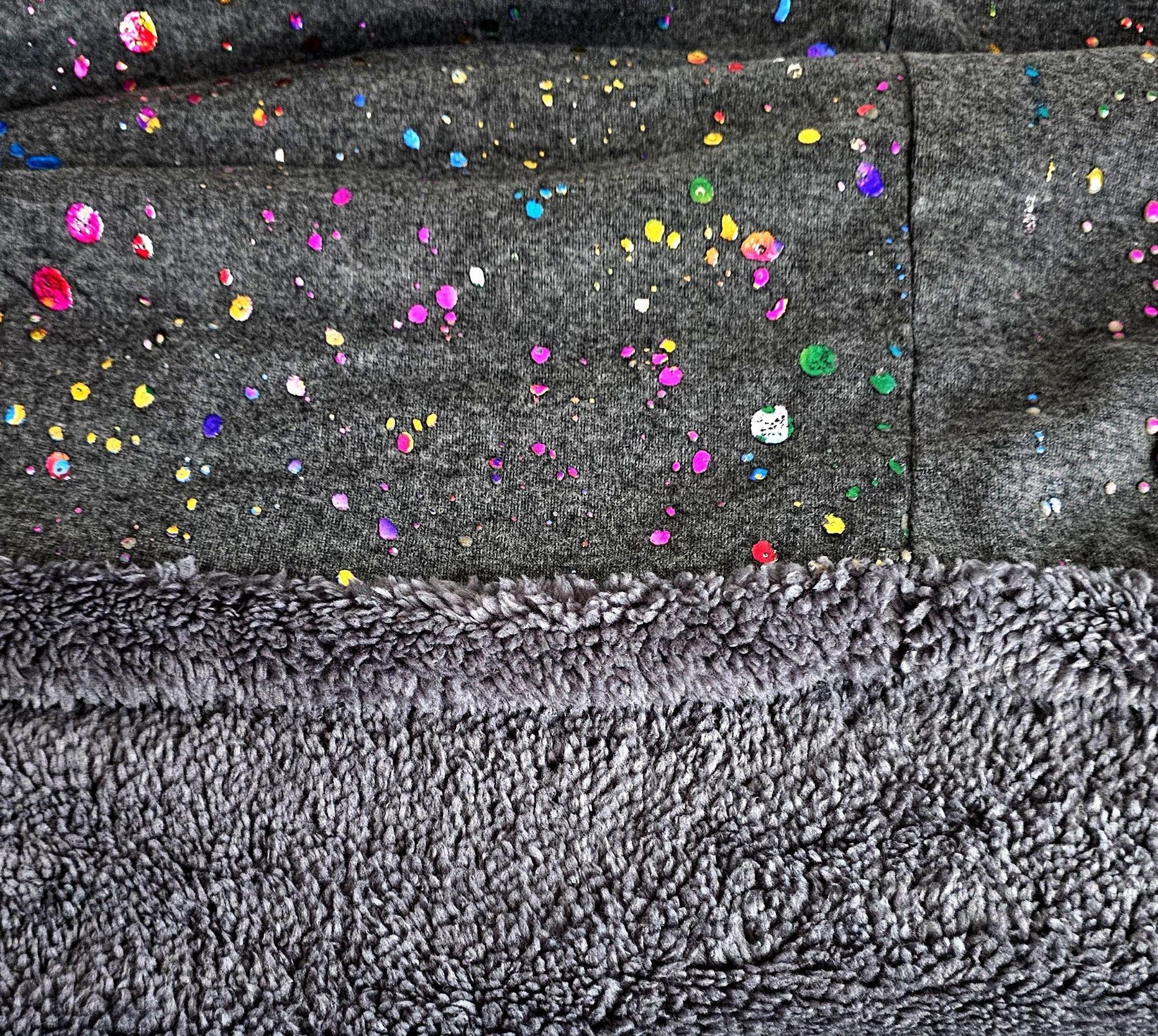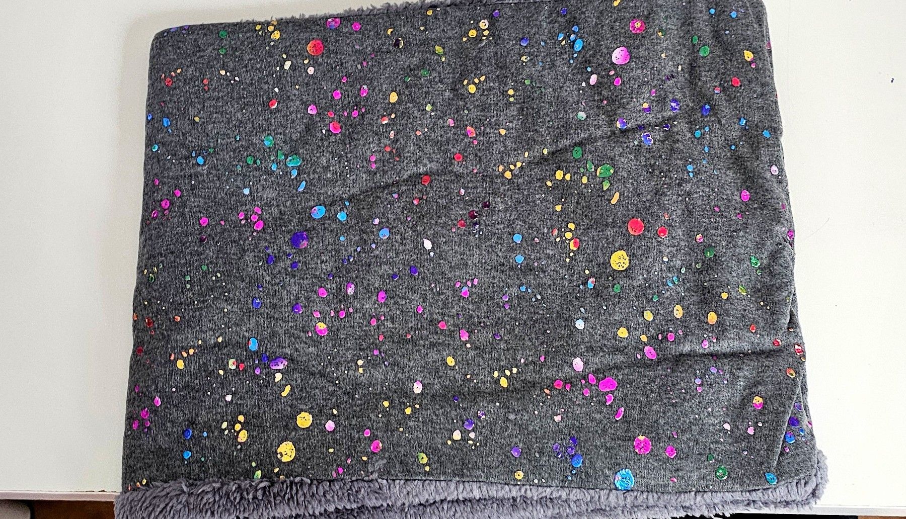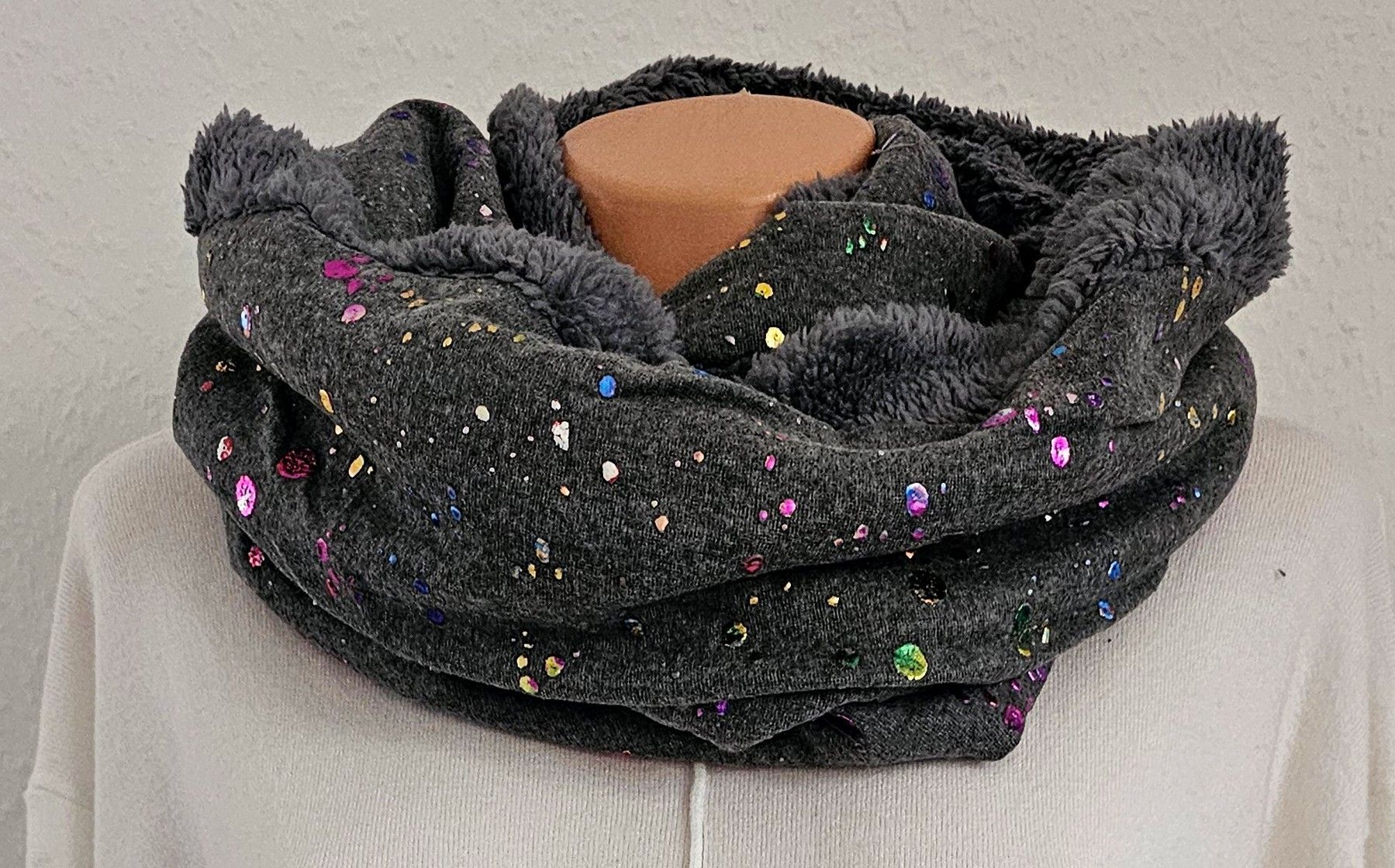 Blogger Kuscheliger Winterschal Rundschal Loop Teddyfell bunte Glitzerpunkte Grau