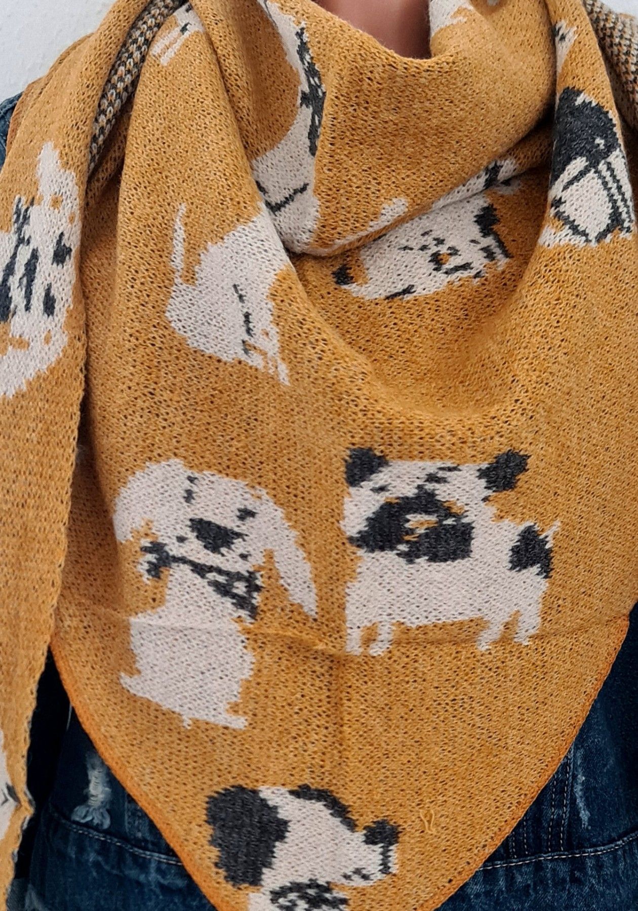 Blogger XXL Softes Dreieckstuch Schal Stola Hundeprint Viskose Wolle Senfgelb/ Beige