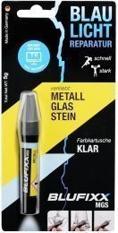 BLUFIXX - Metall Glas Stein - Nachféllkartusche klar (5g) âEuroEuro Hersteller: N A âEuroEuro BLUFIXX MGS Nachféllkartusche in KLAR fér Metall, Glas und Stein Fér unsichtbare Ergänzungen und Verklebungen! Mit Blaulicht reparieren, verbinden, ergänzen oder modellieren. In wenigen Sekunden fertig âEur