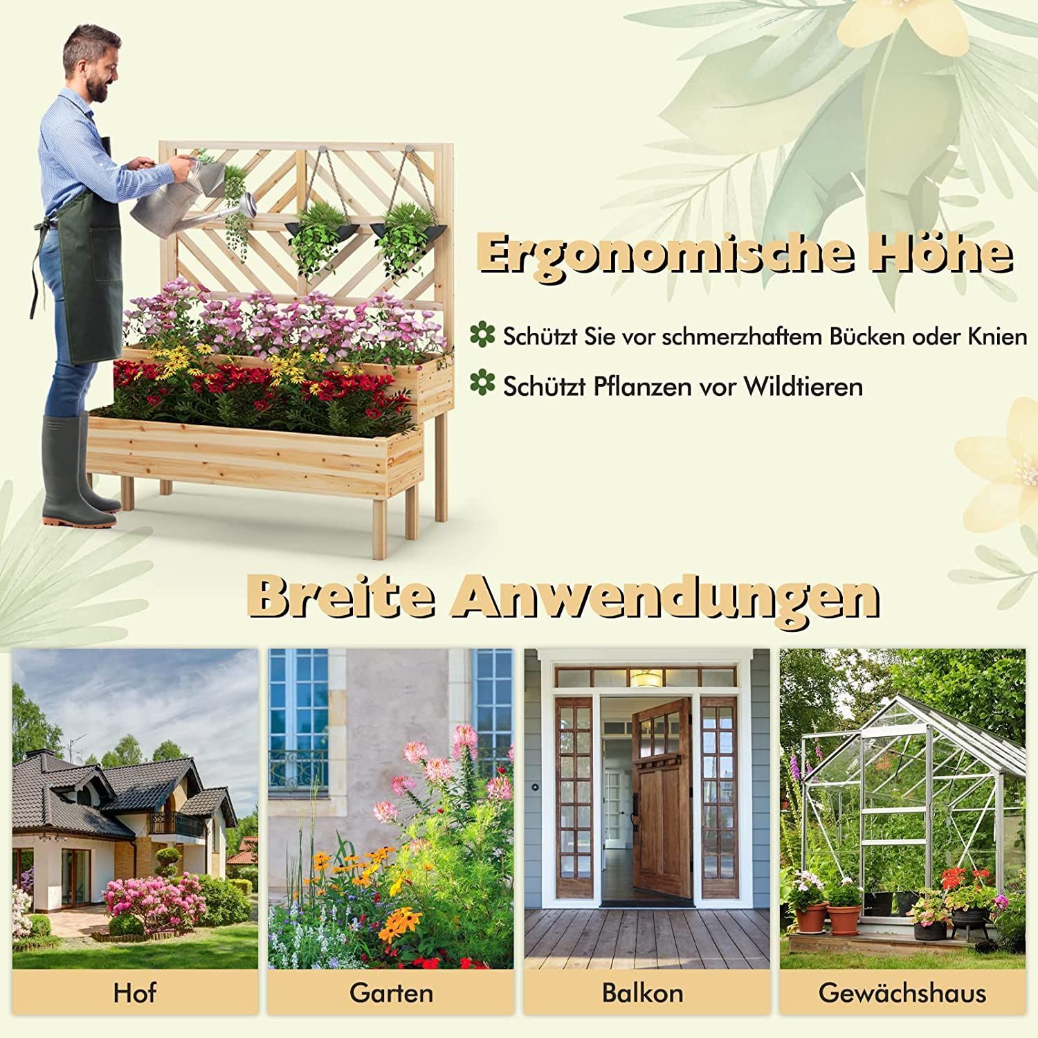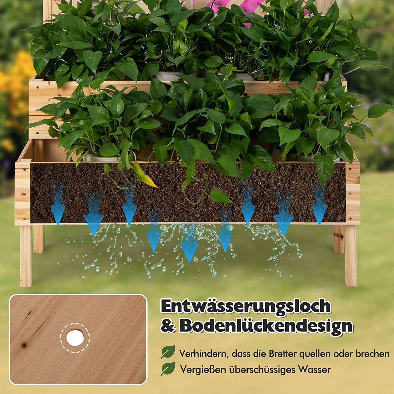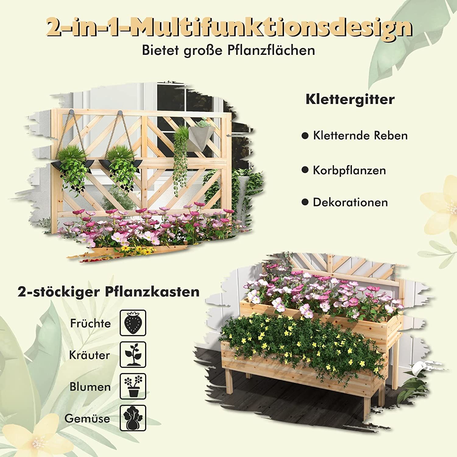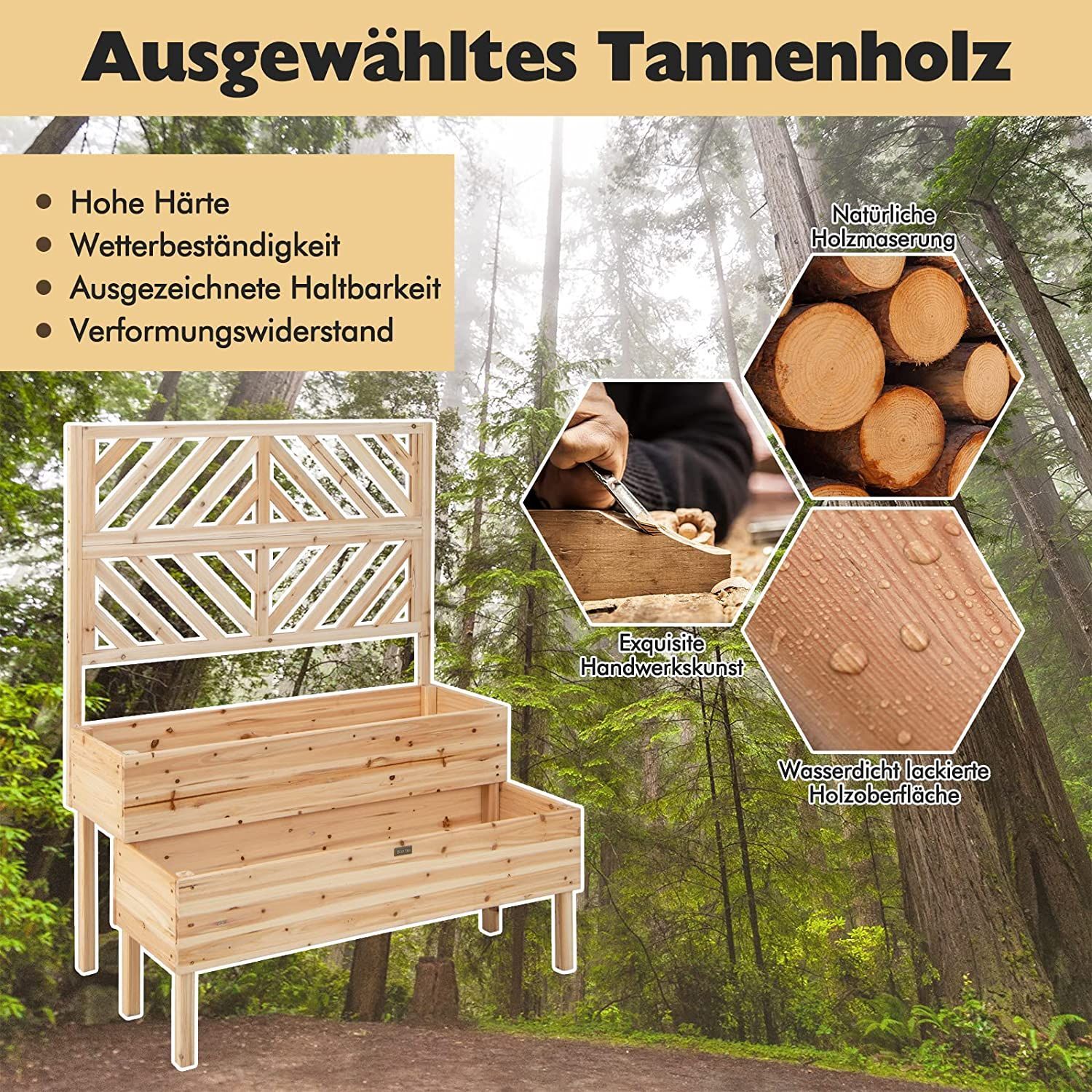 Blumenkasten mit Spalier aus Tannenholz, Gartenspalier mit 2 Rankkästen, Pflanzkasten