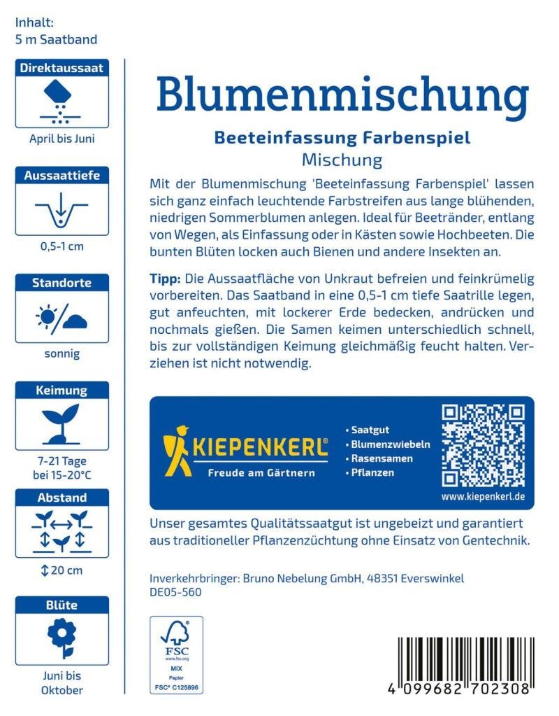 Kiepenkerl Blumenmischung Beeteinfassung Farbenspiel, Saatband, niedrige Sommerblumen
