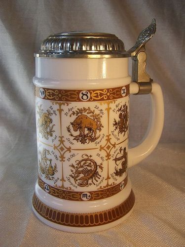Angebot : Milchglas Bierseidel Krug mit 12 Sternzeichen auf der Krug-Wand. Sternzeichen - Widder ist wiederholt, großformatig auf dem Deckel abgebildet. Deckel und Krug mit - BMF N Made in West Germany gemarkt. Max. H.- 18,5 cm, max. D. unten - 10,5 cm. TOP-Zustand