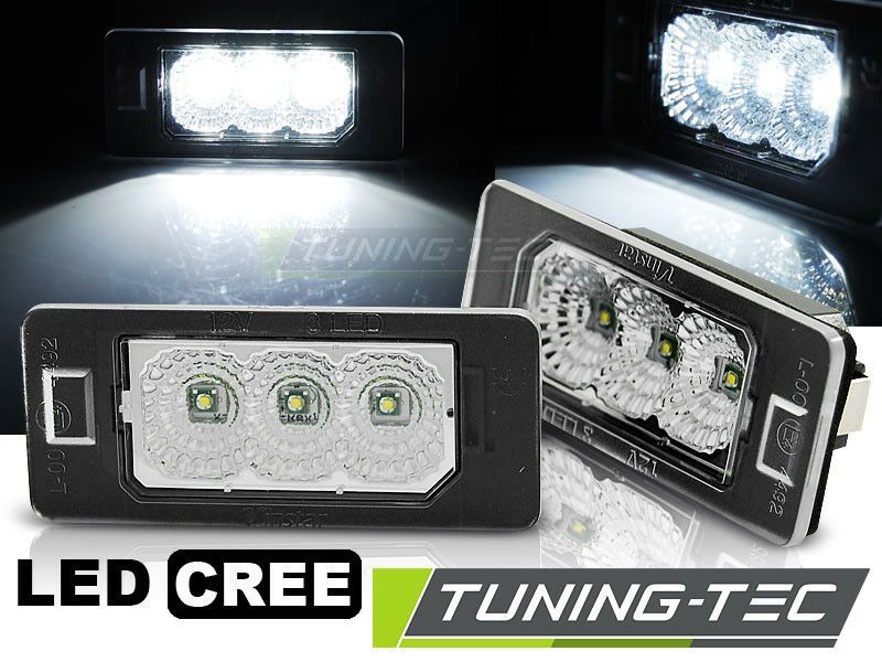 Artikelbezeichnung 1 Satz = 2 Stück Cree LED Kennzeichenbeleuchtung Nummernschildbeleuchtung für viele BMW Modelle, siehe auch Fahrzeugverwendungsliste Mit je 3 hellen Cree LED´s, Klar - Glas, Lichtfarbe ca. 6000K (Weiß) • europaweite Zulassung im Bereich der STVZO • Plug&Play: Kompatibel zu all