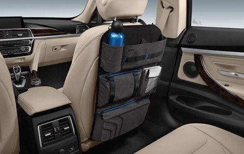 Die hochwertige BMW Lehnen Tasche wird an der Rückenlehne der Vordersitze befestigt und bietet den Passagieren im Fond ausreichend Verstaumöglichkeiten, um die verschiedensten Reiseutensilien übersichtlich und griffbereit zu verstauen.