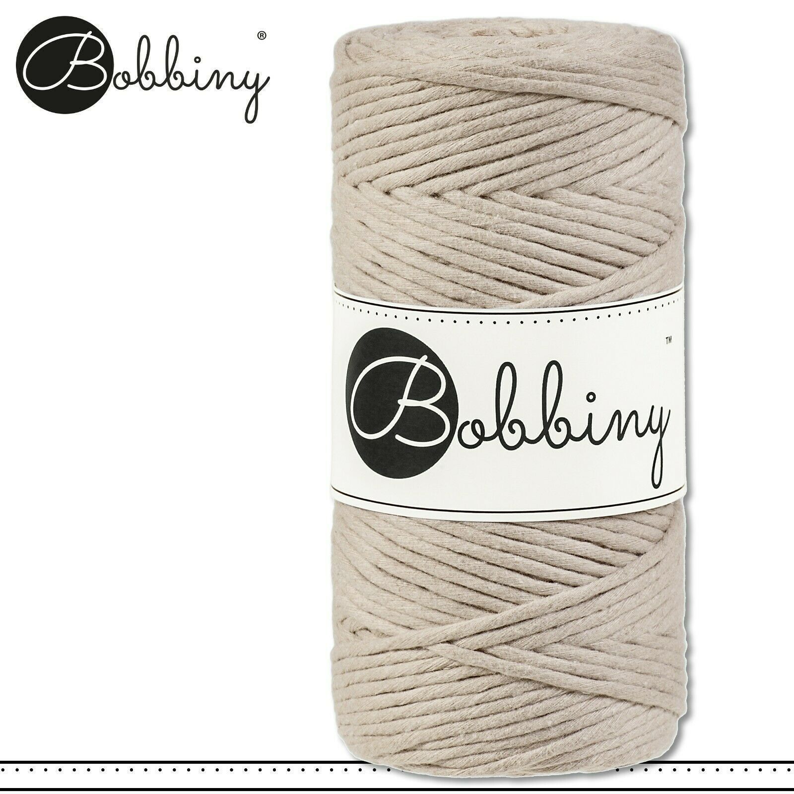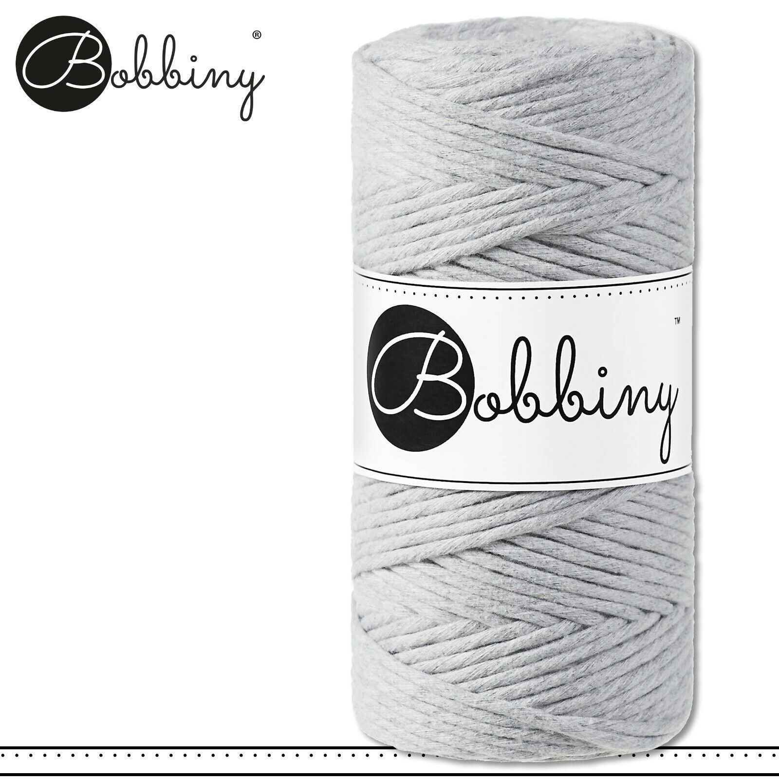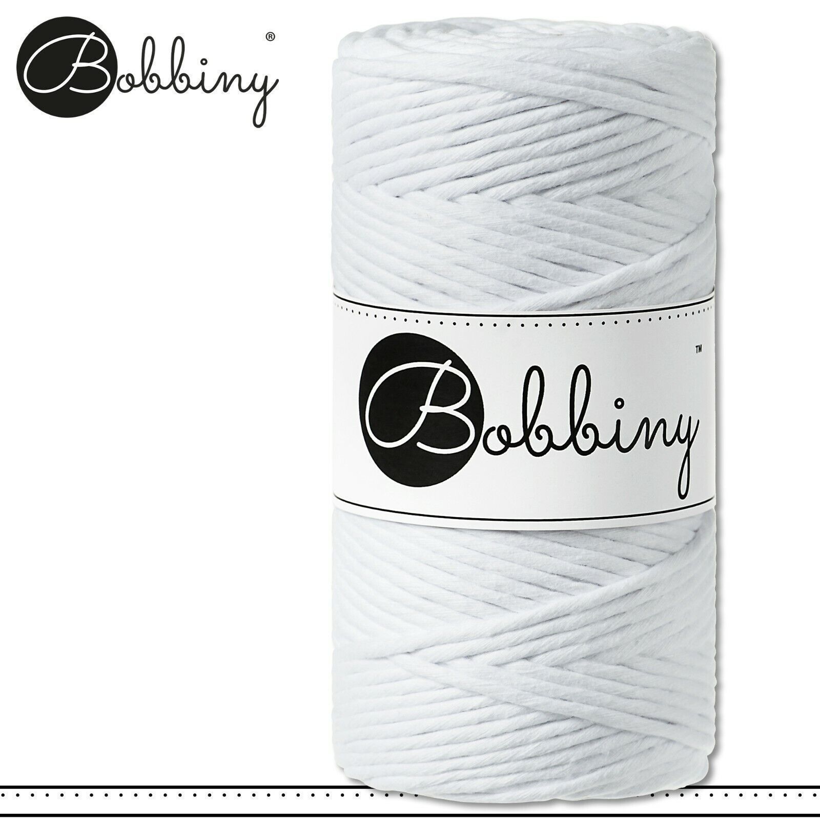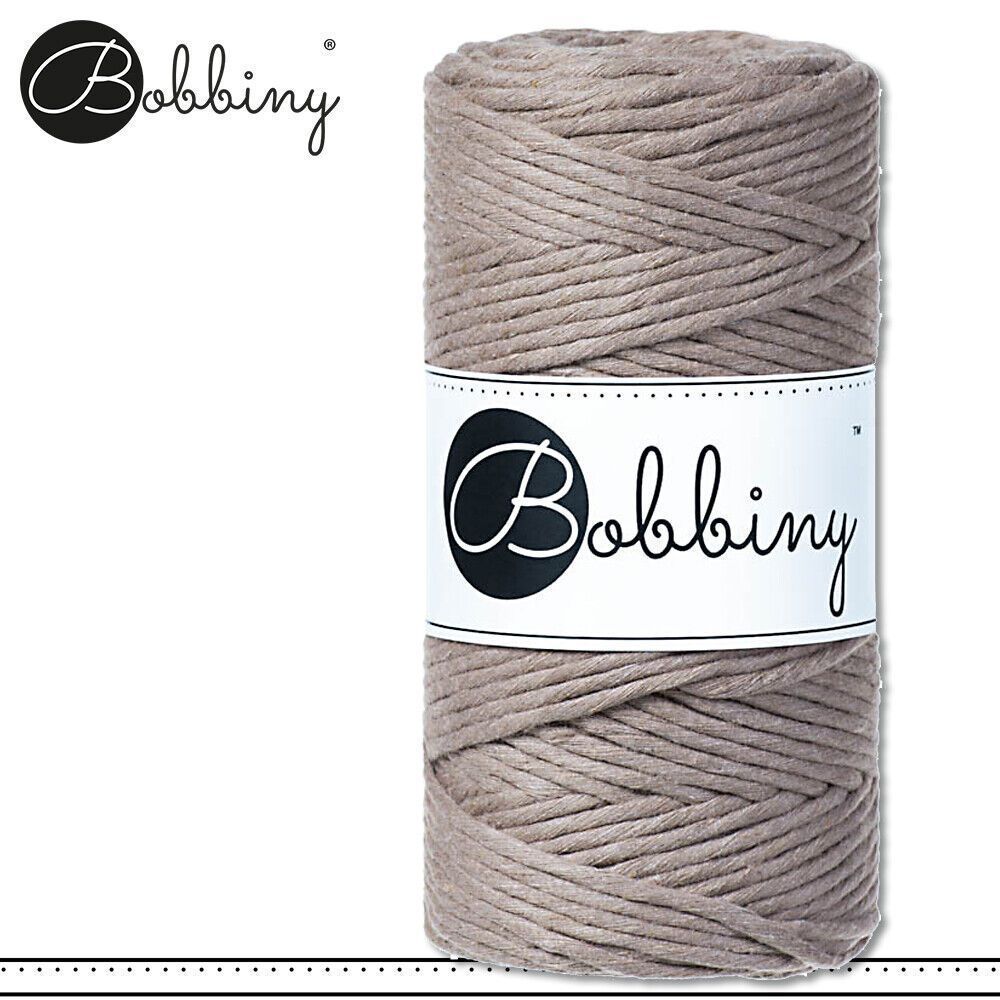 Bobbiny 100 m Makramee-Kordel 3 mm Beschreibung Euro Material : 100% recycelte Baumwolle Euro Öko-Tex-Zulassung Standard 100 Euro Gewicht : circa 160 g Euro Durchmesser : 1,5 mm Euro Laufmeter : 100 m Euro Nadelstärke : 3 Euro Herstellungsland : Europa Euro Verwendungsbeispiele : verschiedene Makram