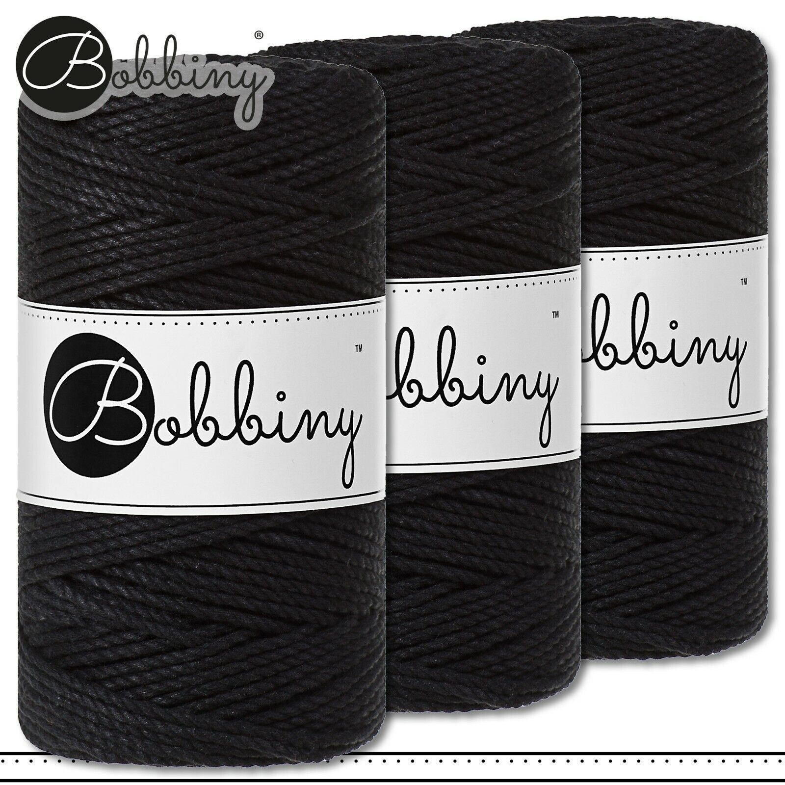 Bobbiny 3 x 100 m Makramee-Kordel 3 mm dreifach gedreht | Black | Premium