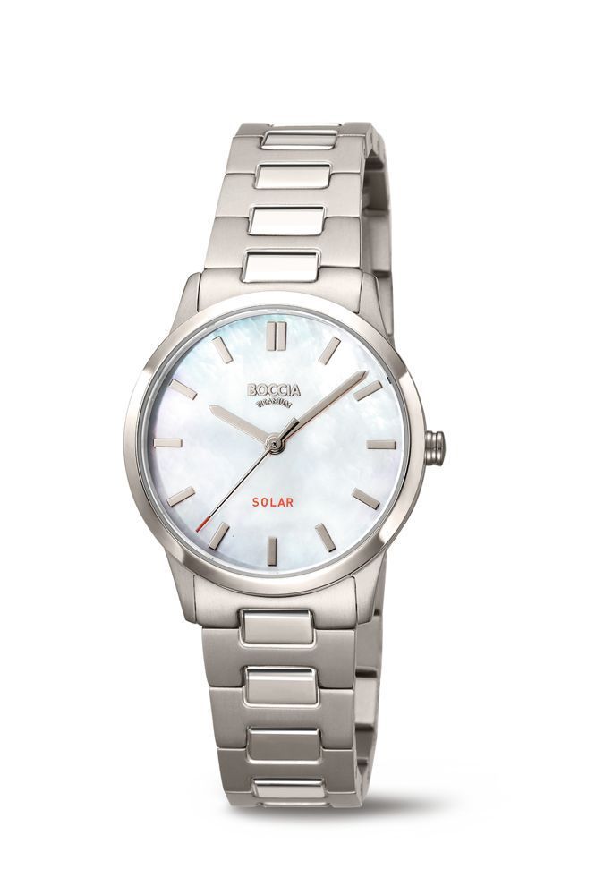 Solaruhr mit Titangehäuse und polierter Lünette. Titanarmband mit Druckfaltschließe auf welcher sich das Boccialabelbefindet. Die Aufladung der Uhr erfolgt durch die Sonne und alle anderen Arten von Licht. Mineralglas, 5 ATM wasserdicht