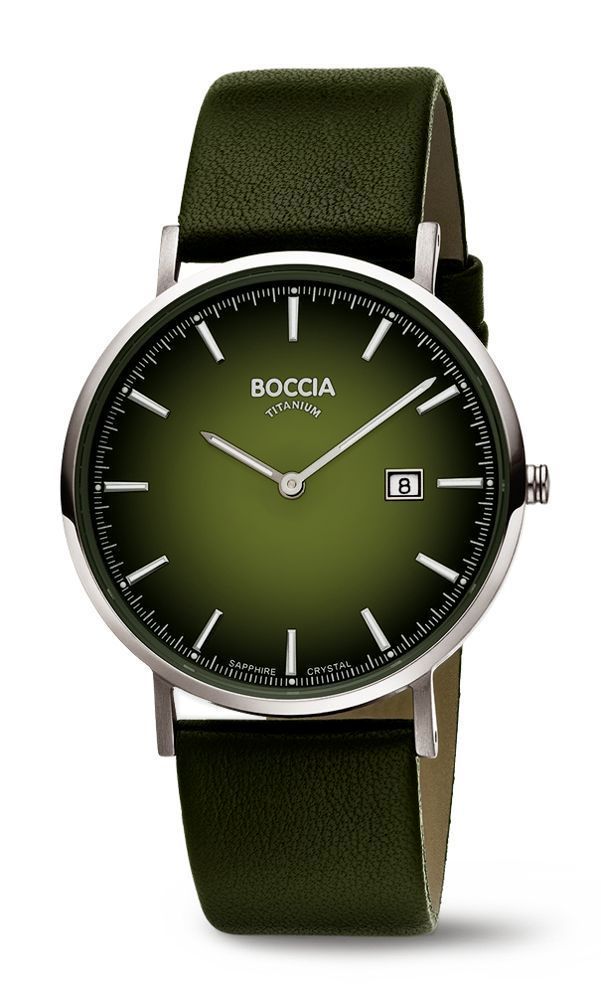 tolle Herrenuhr vom Titanspezialisten BOCCIA - matt gearbeitetes silberfarbenes Reintitangehäuse, dunkelgrünes Lederband mit silberfarbener Reintitan-Dornschließe, kratzbeständiges Saphirglas, 3 ATM wasserdicht. Durch das Titan können auch Allergiker diese Uhr ohne Bedenken täglich tragen.