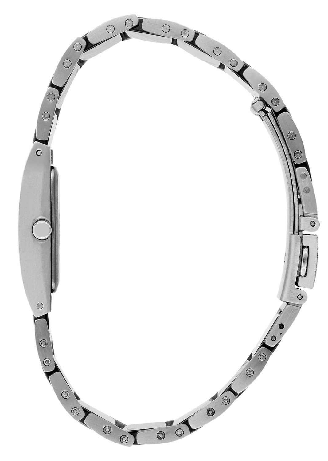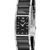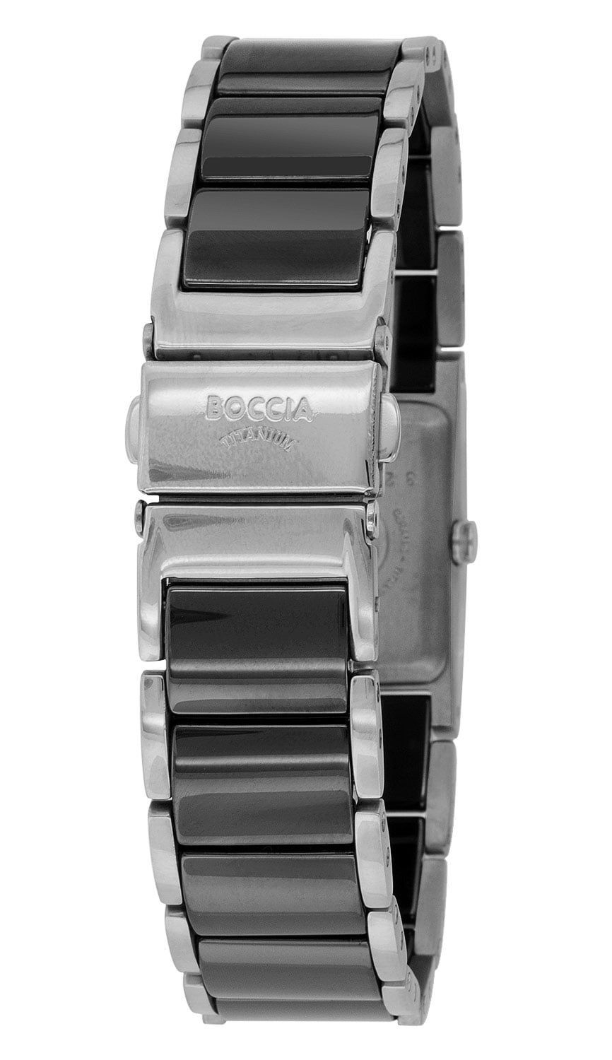 gewölbtes Gehäuse aus antiallergischem Reintitan, poliert, matt gebürstete Seiten, kratzunempfindliches Mineralglas, wasserdicht geprüft bis 5 bar, Breite 18,5 mm, Höhe 7,3 mm, poliertes Armband aus Titan und schwarzer Keramik, bequeme Titan-Faltschließe mit Drückern und Logogravur, präzises Quarzwerk, schwarzes Zifferblatt, polierte silberne Zeiger, Zahlen und Indizes, in Boccia-Präsentbox