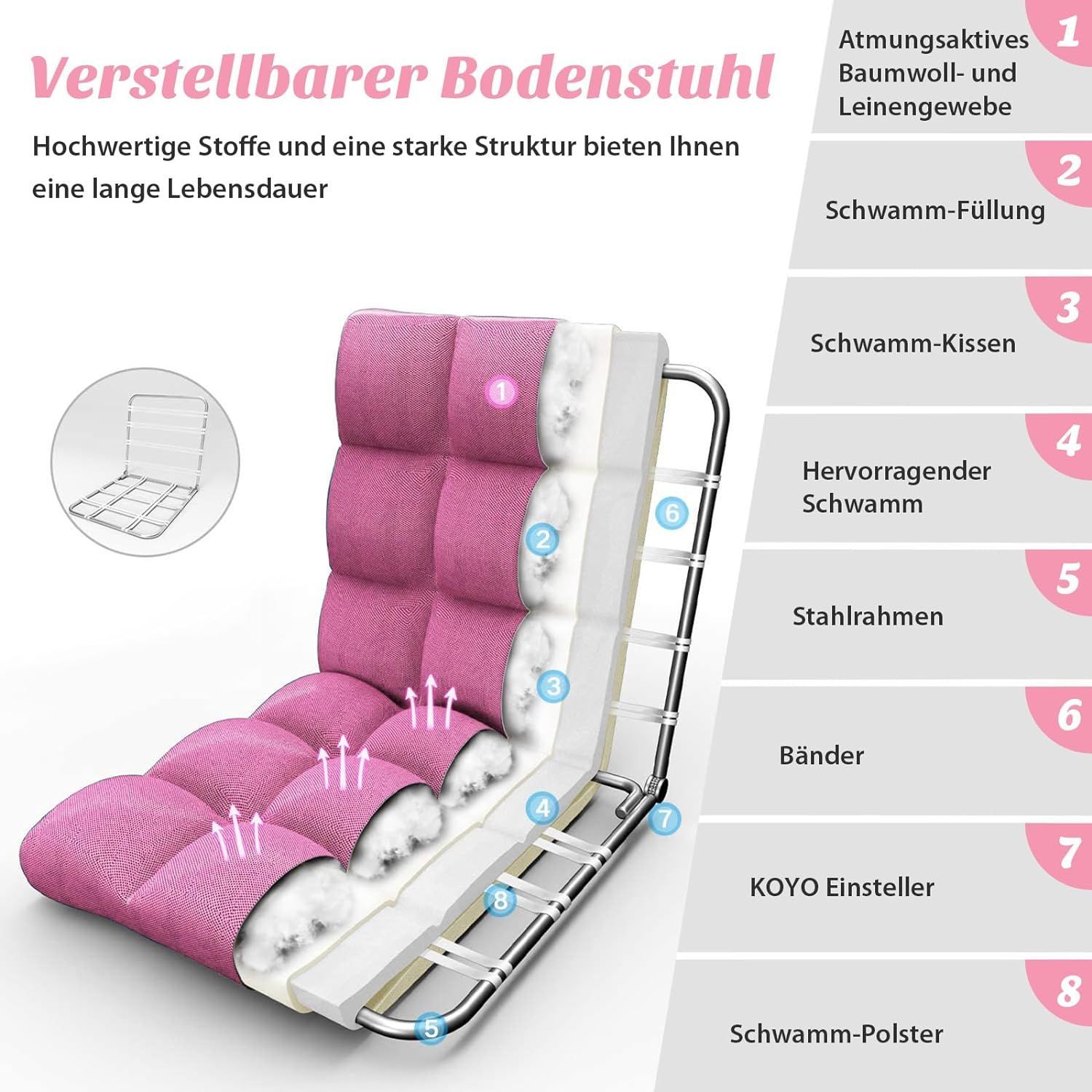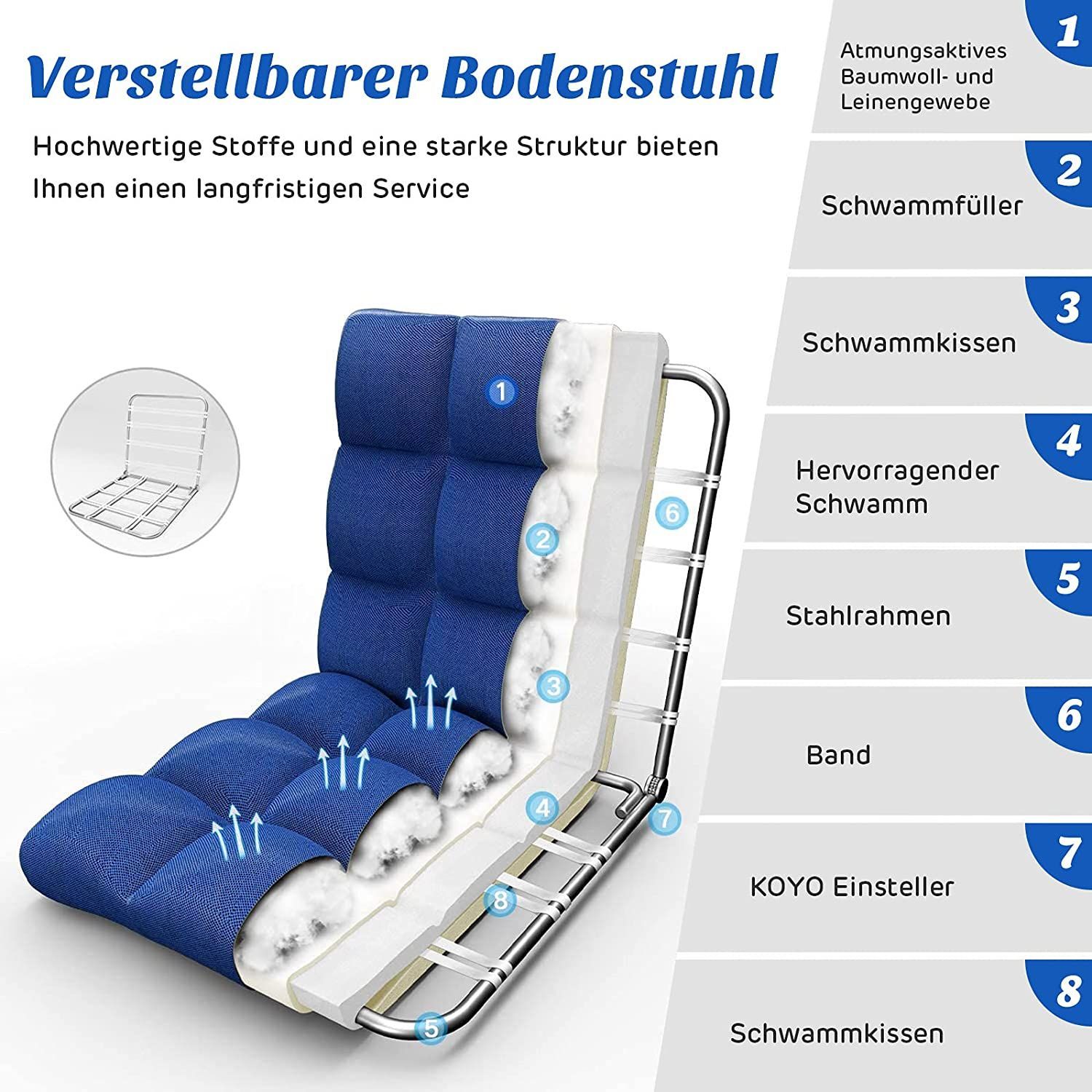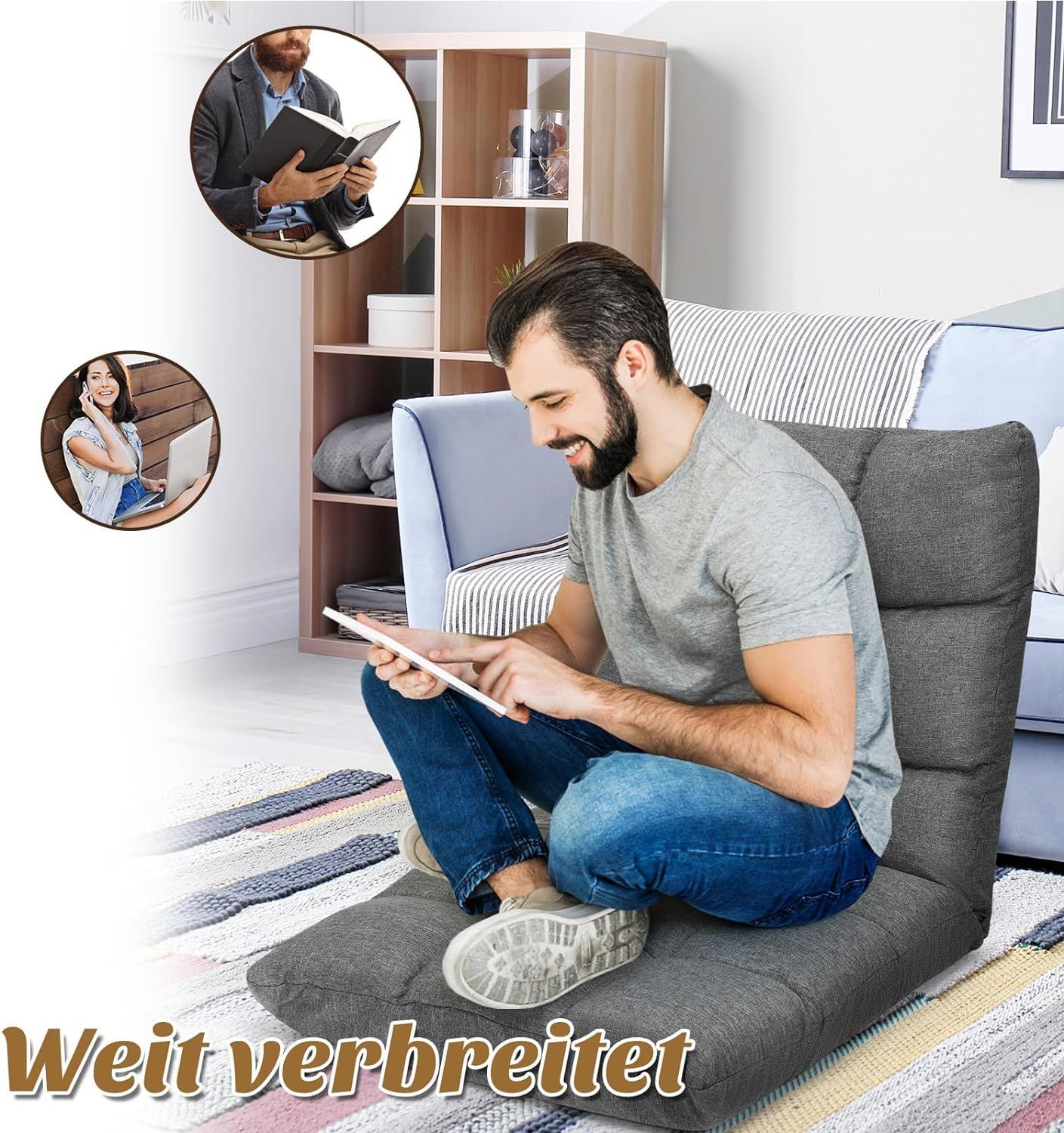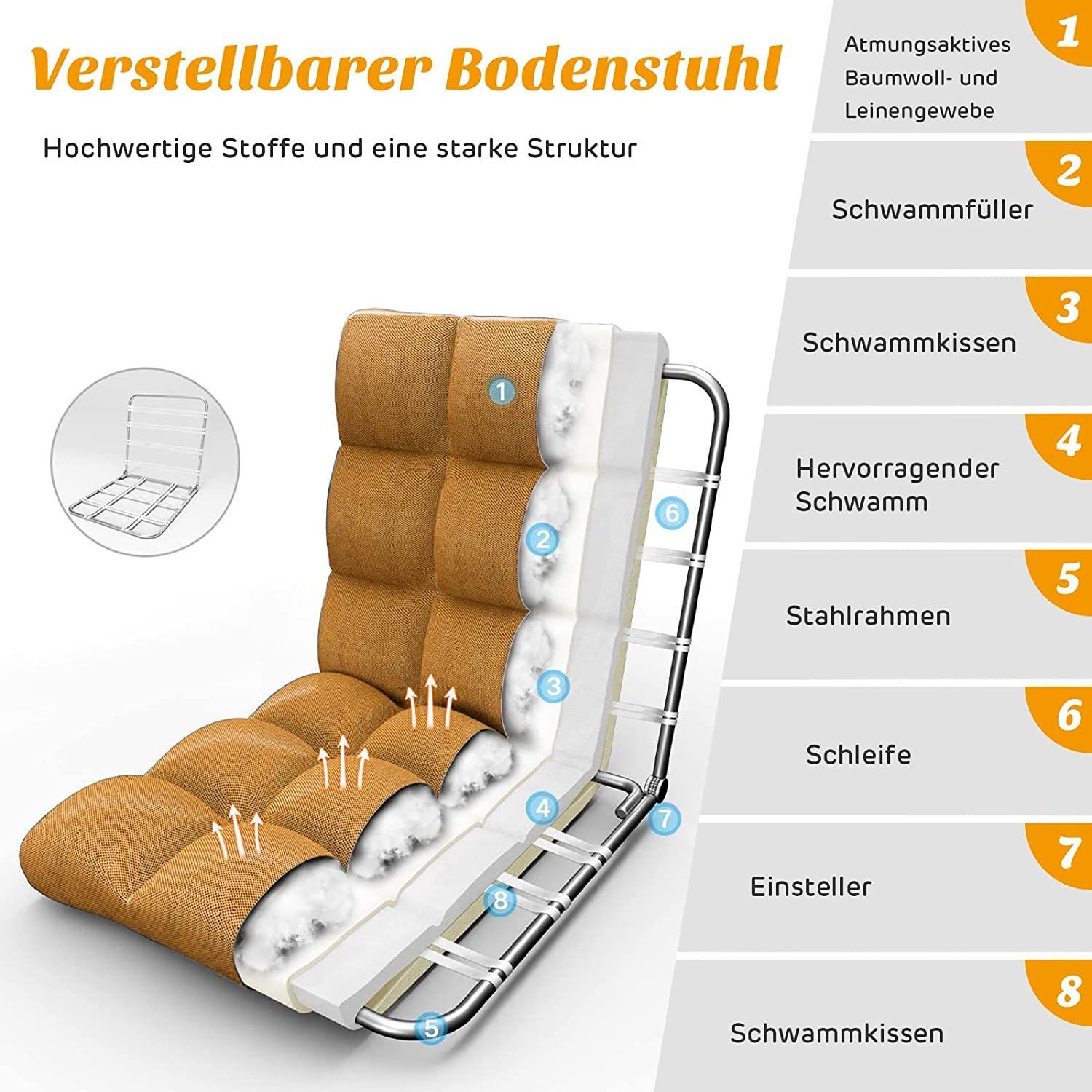 Bodenstuhl verstellbar, Bodensessel gepolstert, Bodenkissen Rückenlehne, Fensterstuhl
